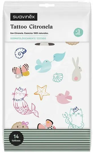 Suavinex citronella mosquito repellent tattoos are cute stickers that are applied directly to the skin. They release a delicate citronella essence that keeps insects and mosquitoes away, pleasant for the child but unpleasant for the insects.