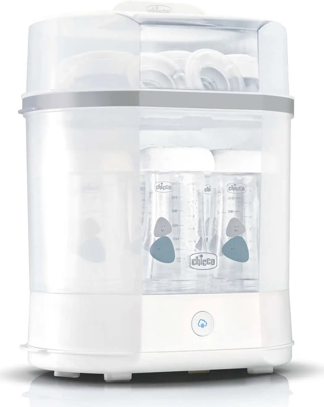 Sterilizes bottles and small objects quickly, naturally, and effectively. It uses steam to naturally sterilize objects, eliminating up to 99.9% of harmful germs present in the home; if the lid is always closed, sterilization is guaranteed for 24 hours.