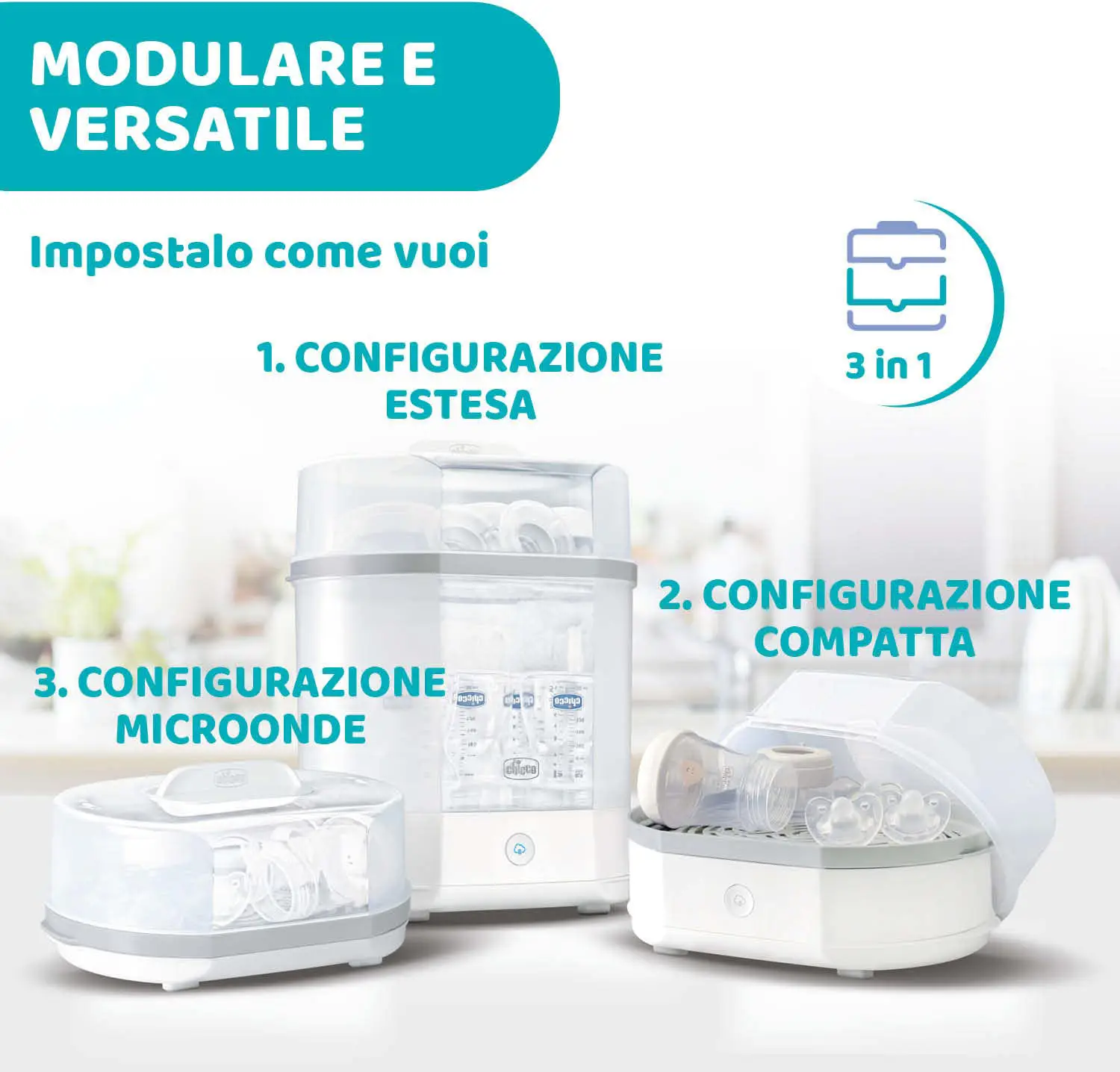 3-in-1 modular system: with the Full Size mode, when fully loaded, you can sterilize a large number of bottles and other objects at the same time, or you can use the Compact mode if you only need to sterilize a few objects. Thanks to the special base and lid, you can sterilize a bottle or an object directly in the microwave.