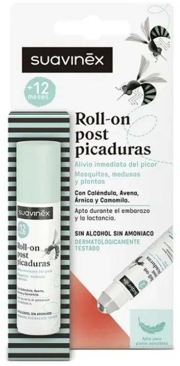 The Suavinex After-Sting Roll-On immediately soothes skin irritated by contact with insects, plants, and jellyfish. It is formulated for sensitive skin and is also ideal for pregnant women and children from 6 months of age. Its ammonia-free formula is also compatible with breastfeeding.