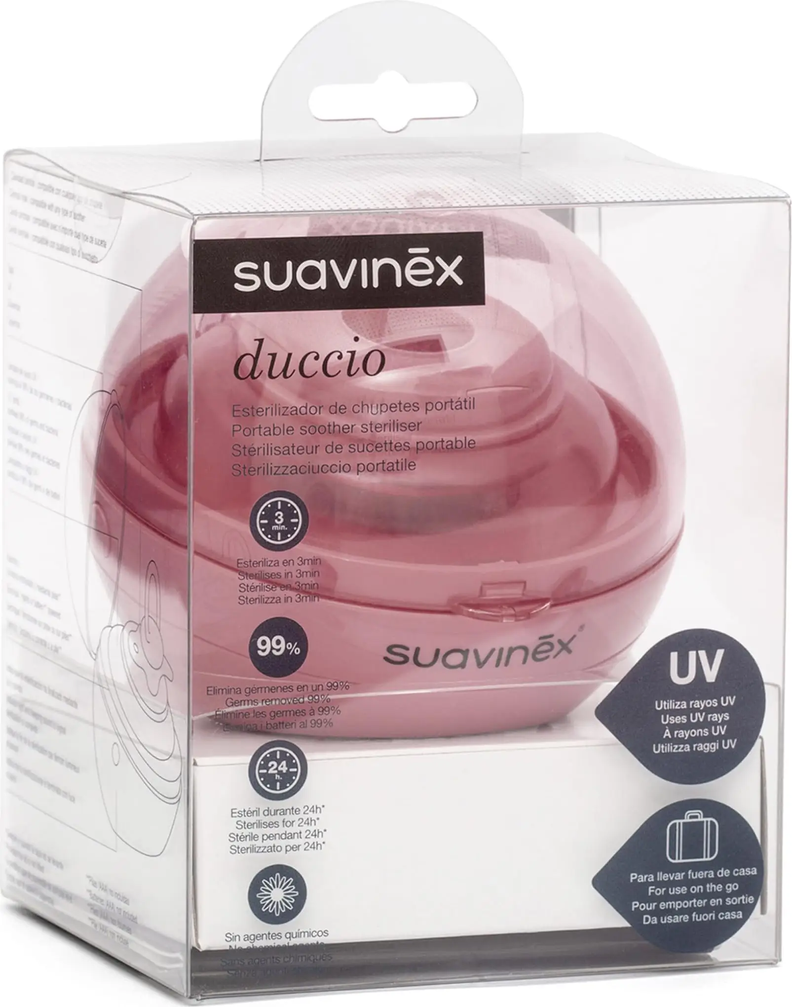 The Duccio pacifier sterilizer sterilizes quickly, in just 3 minutes, and safely thanks to ultraviolet (UV) light. Compatible with any type of pacifier. It works with a USB cable or batteries. Practical and convenient! Eliminates 99% of germs and microorganisms that can cause gastrointestinal disorders. A great ally for caring for little ones.