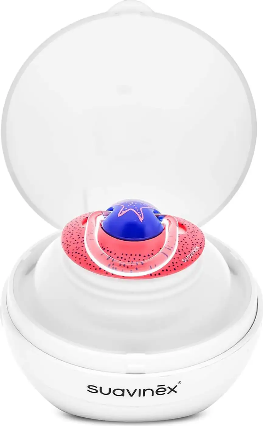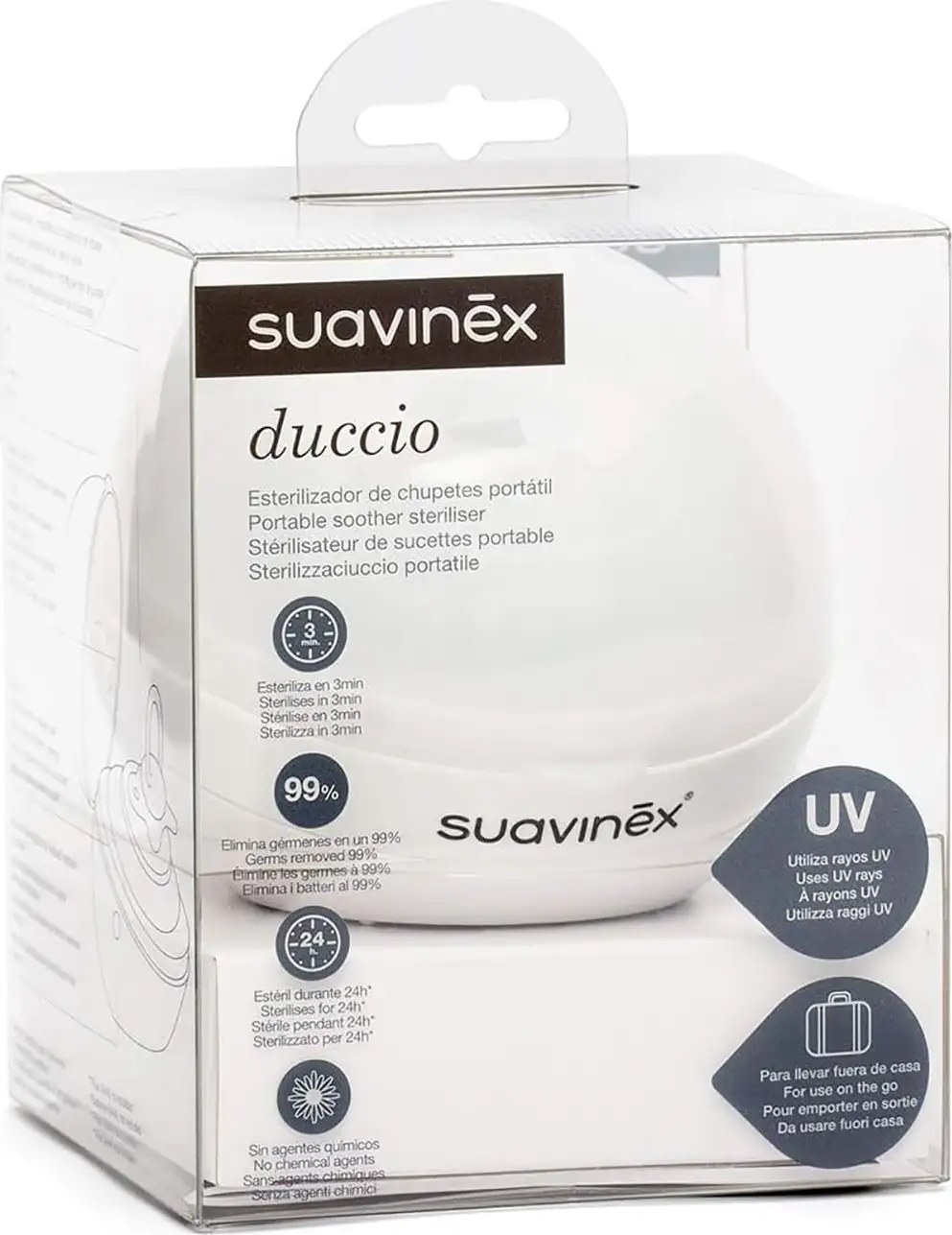 Duccio Suavinex Perla is the pacifier sterilizer that eliminates 99% of germs, viruses, and bacteria that can cause gastrointestinal infections in just 3 minutes, sterilizing quickly and safely using ultraviolet light (UV rays).