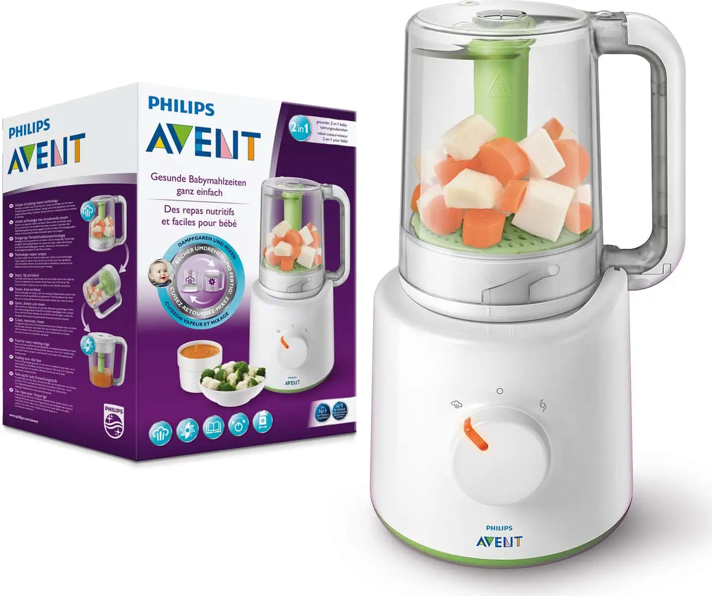 The Avent Philips Easy Pappa 2-in-1 Blender is a cutting-edge product designed to provide your baby with healthy nutrition as they grow. Your baby should receive a well-balanced diet from infancy: steaming and blending food will make this a habit. TECHNICAL FEATURES: - sleek, compact design - preparation of baby food for every weaning stage - efficient steaming cycle - excellent preservation of the food's nutrients - quick meal preparation - equipped with an acoustic signal that signals the end of the cooking process ACCESSORIES INCLUDED: - recipe book with advice for the 3 weaning stages - measuring cup - spatula