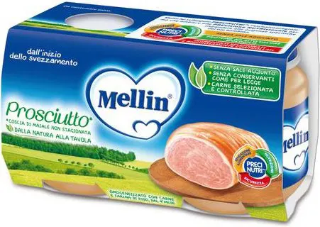Mellin Prosciutto, puree with ham* meat and rice flour without added salt.