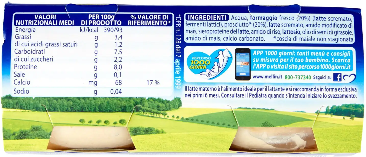 Water, fresh cheese (20%) (skimmed milk, lactic ferments), ham* (20%), skimmed milk, modified corn starch, whey proteins, rice starch, lactose, sunflower seed oil, corn starch, calcium carbonate.