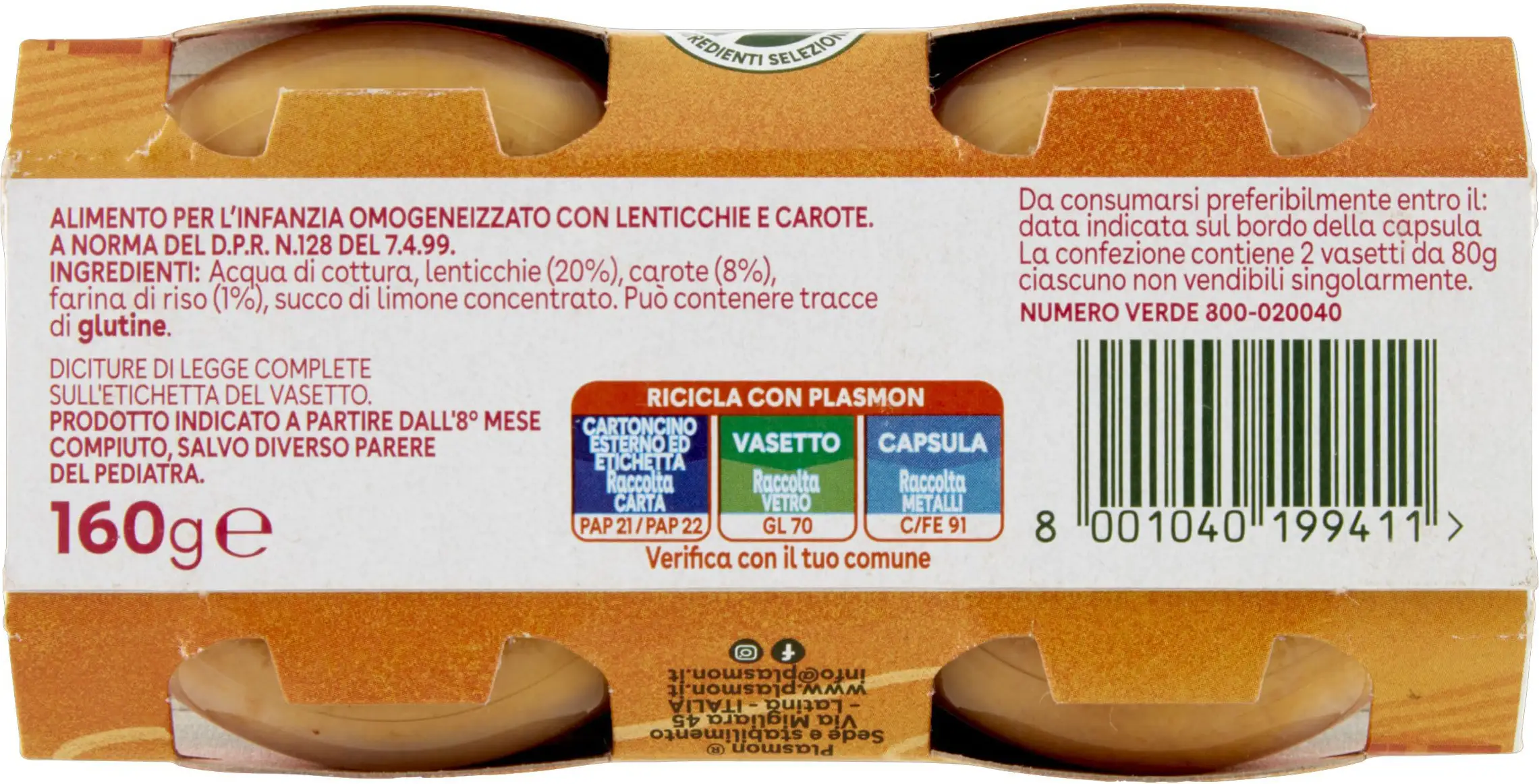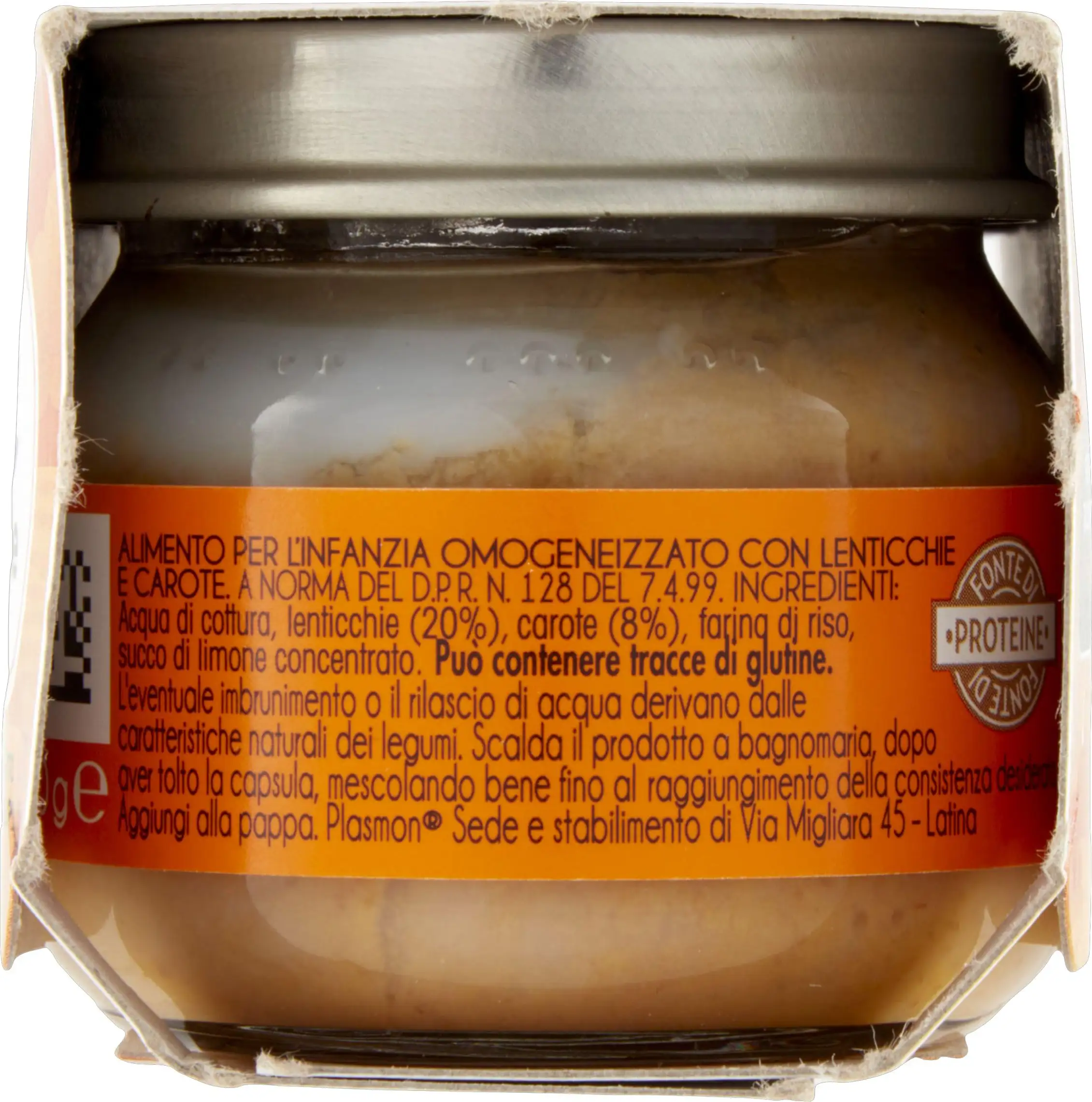 Plasmon Lentils with Carrots puree, consumed in combination with cereals, represents an alternative source of protein to meat, fish, and cheese, as part of a varied diet.