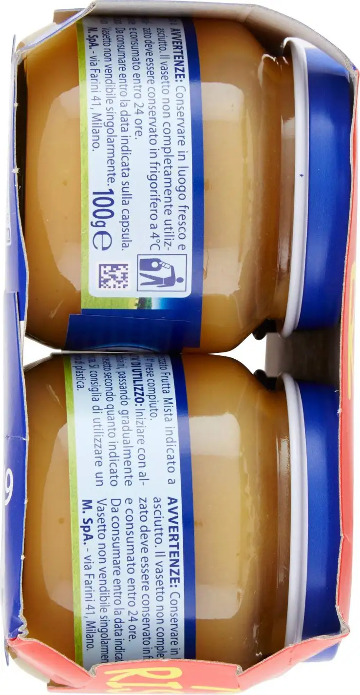Mixed fruit puree (91%) (apple, banana, peach and apricot), water, corn starch, vitamin C.