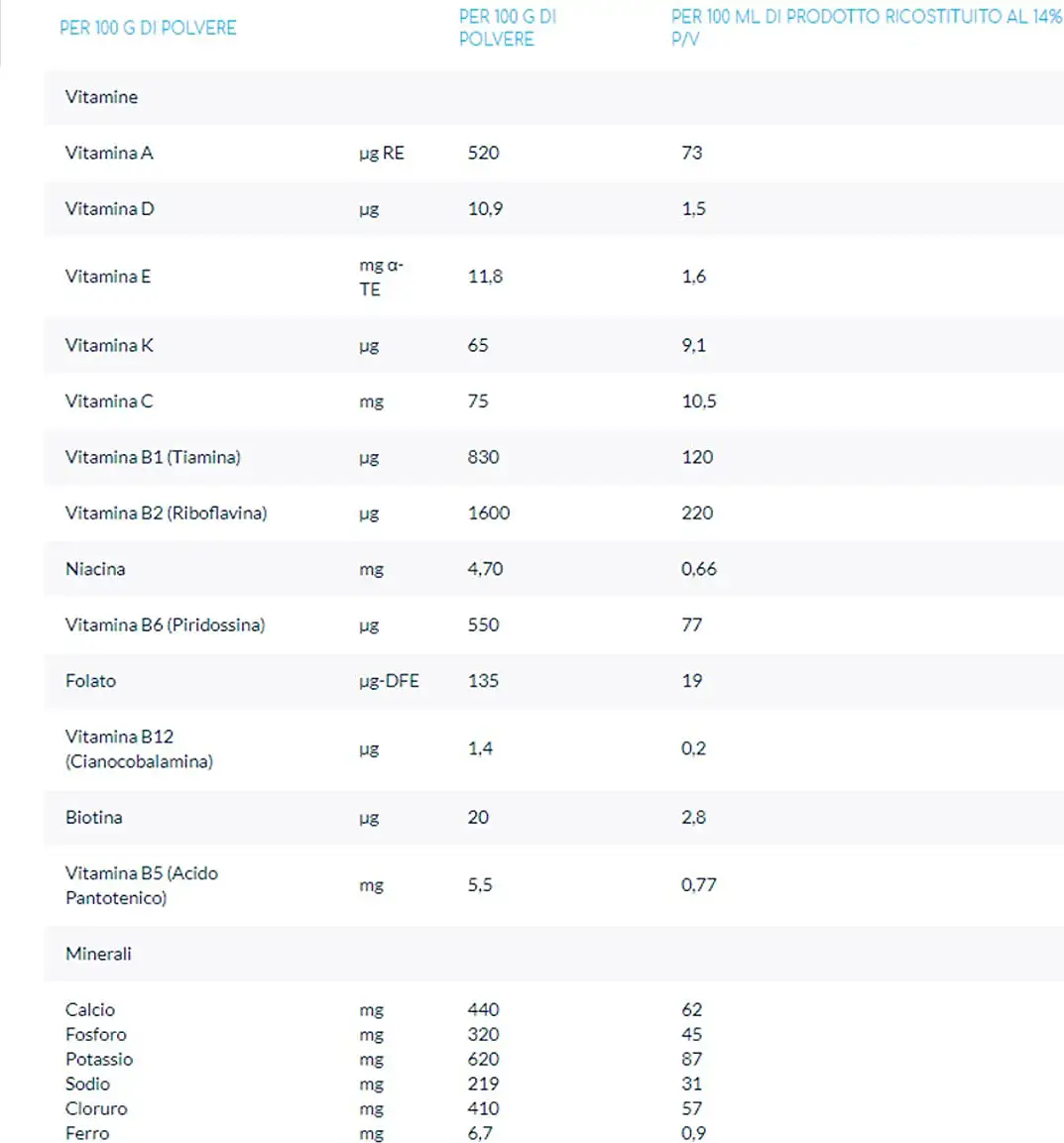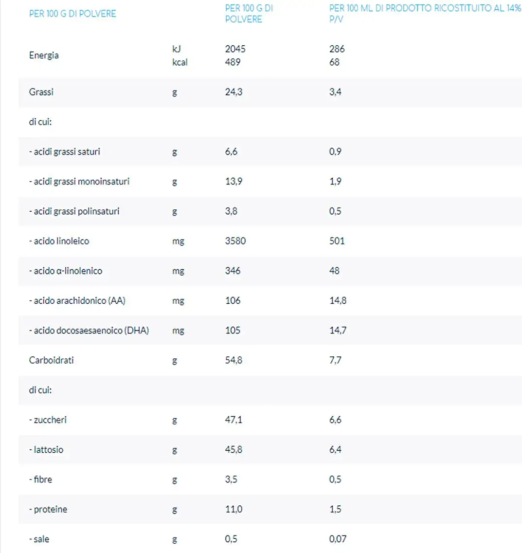Fresh pasteurized milk with 3.2% fat, whey demineralized powder, lactose from milk, vegetable oils (high oleic sunflower, rapeseed, sunflower, coconut), galactooligosaccharides from milk, maltodextrin, whey proteins rich in α-lactalbumin, mineral salts (trisodium citrate, calcium hydrogen phosphate, tripotassium citrate, magnesium chloride, calcium carbonate, potassium chloride, ferrous lactate, zinc sulphate, potassium iodide, sodium selenite, copper sulphate, manganese sulphate), oil rich in α-6 (AA from M. alpina), oil rich in α-3 (DHA from C. cohnii), vitamins (vitamin C, vitamin E, vitamin D, vitamin A, pantothenic acid, niacin, biotin, vitamin B12, folate, vitamin K, vitamin B2, vitamin B1, vitamin B6), choline bitartrate, inositol, emulsifier: lecithin Soy, nucleotides (cytidine-5'-monophosphate, adenosine-5'-monophosphate, uridine-5'-monophosphate, inosine-5'-monophosphate, guanosine-5'-monophosphate), glucose syrup. Palm oil free.