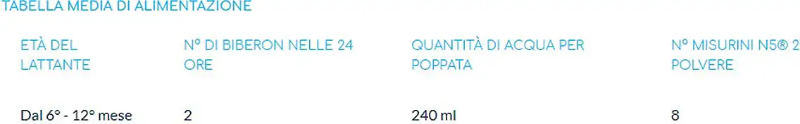 | Age of the infant | N° of bottles in 24 hours | Quantity of water per feed | n° measuring spoons N5 2 powder |