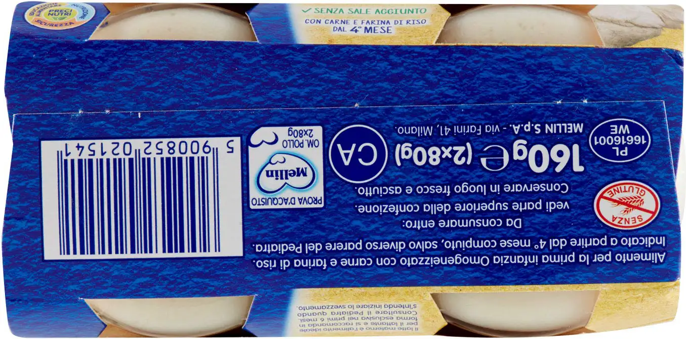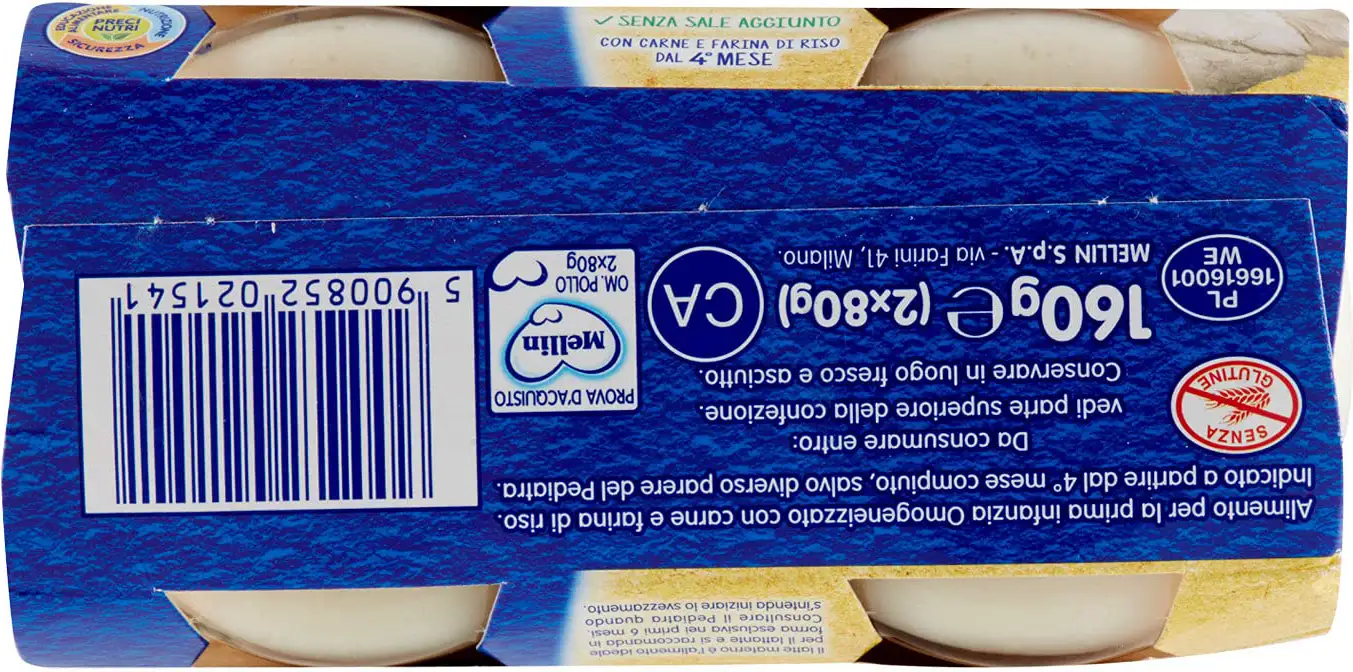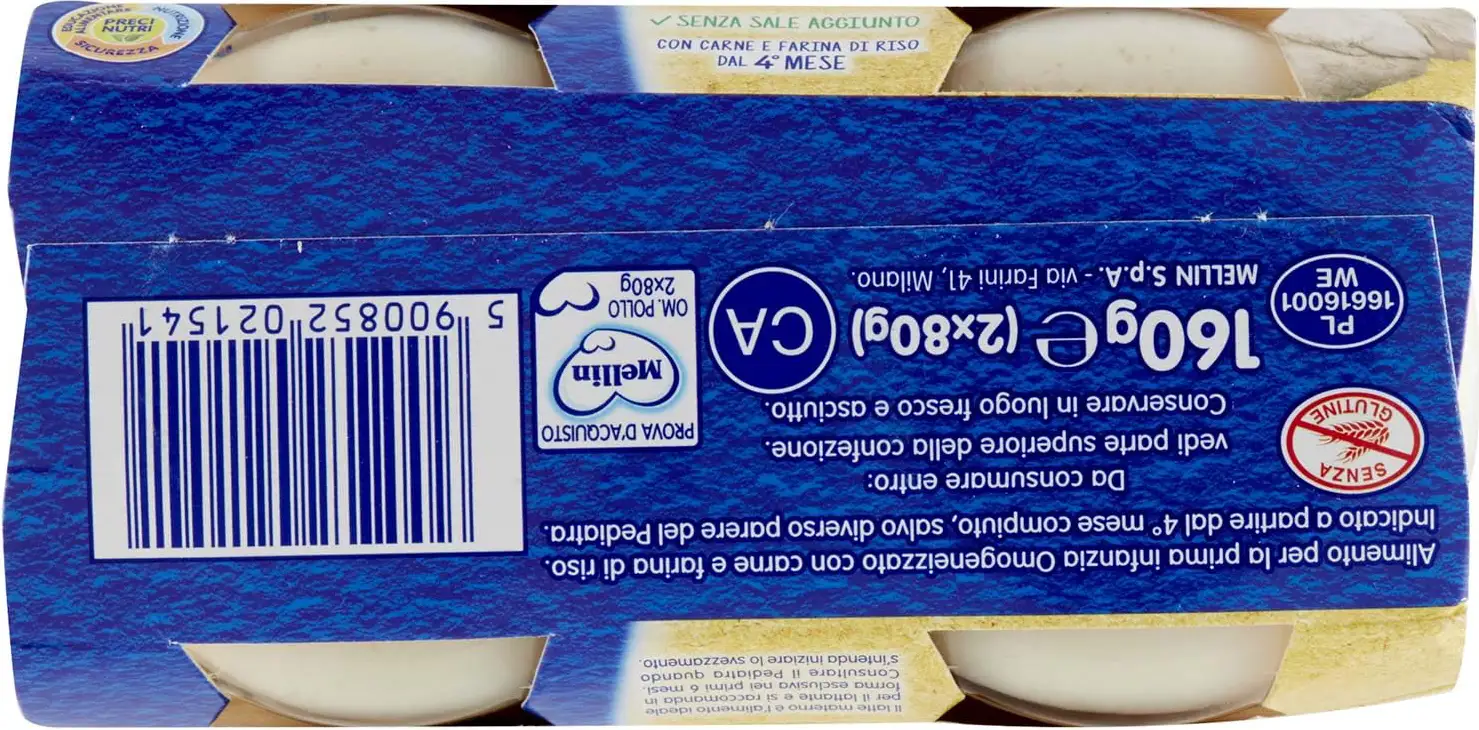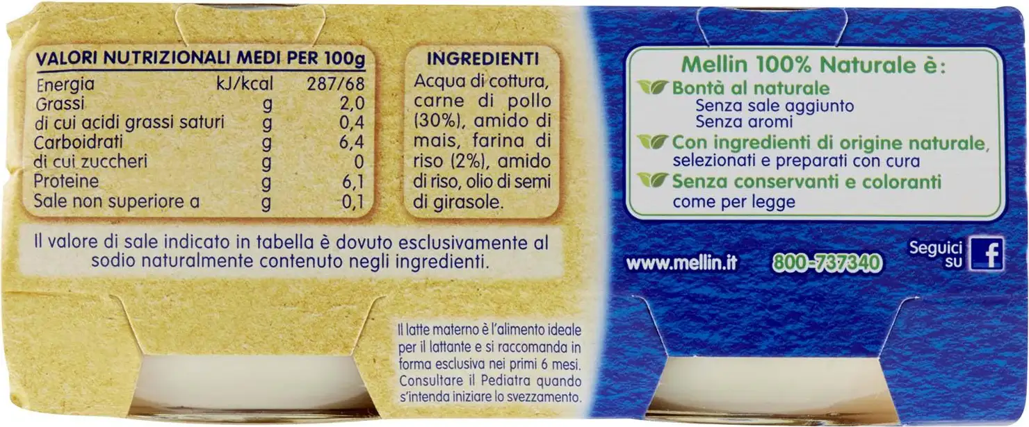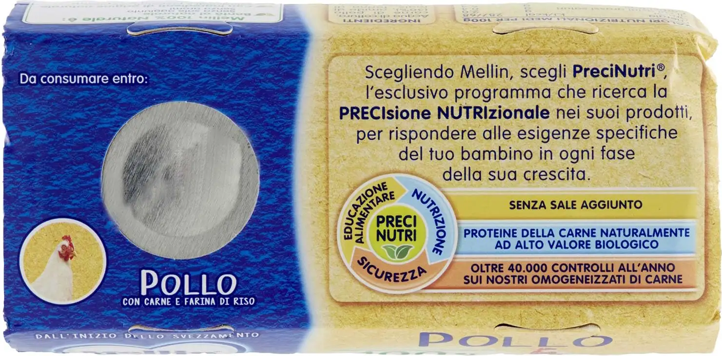 Mellin Meat Purees are particularly suitable for preparing excellent baby food. Made with quality meats, rigorously selected and inspected, they are vacuum-packed to preserve all the nutritional properties of the meat. Mellin Chicken Puree: - Contains no preservatives, colorants, or flavorings, as required by law. - Is gluten-free and free of milk proteins.
