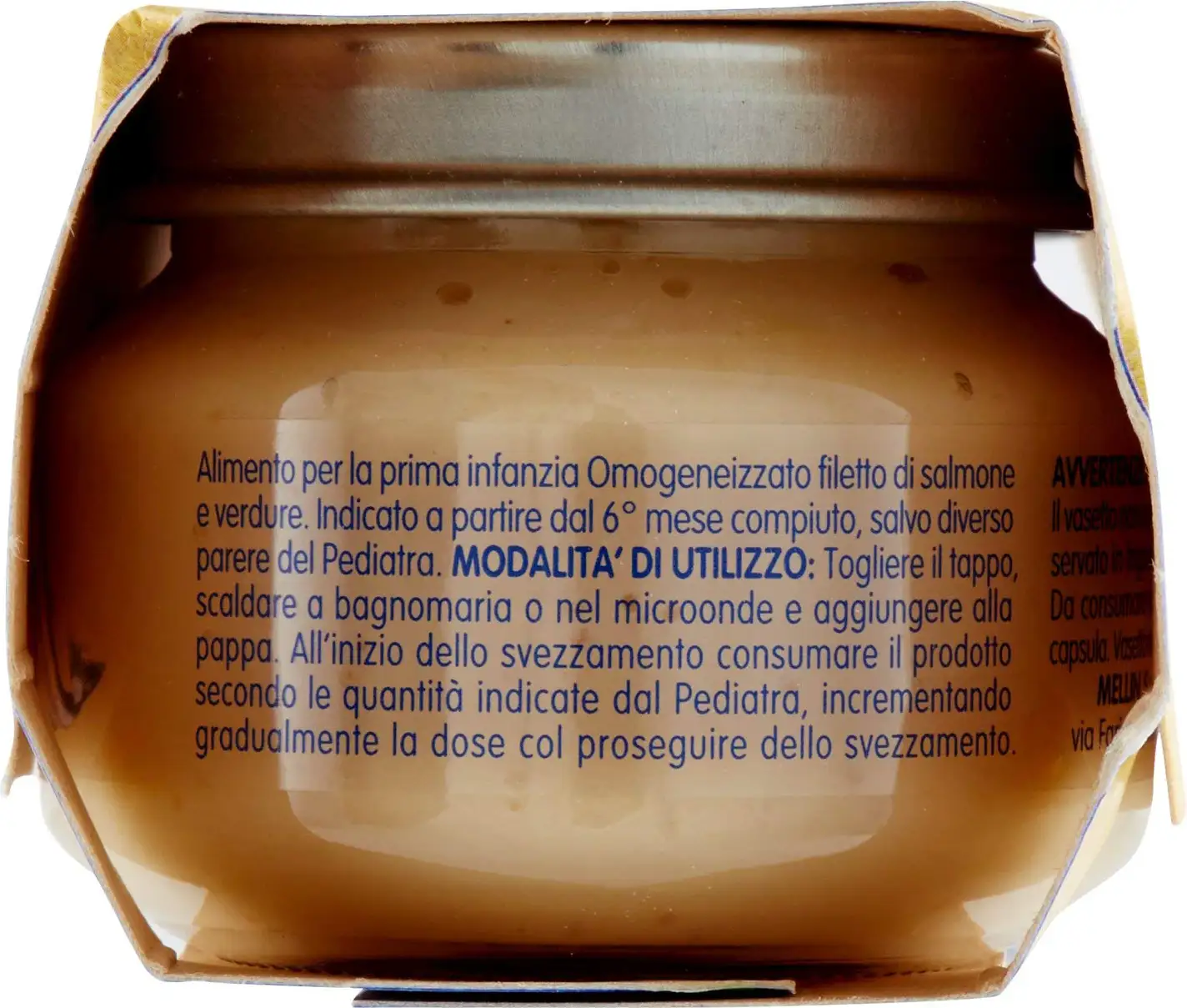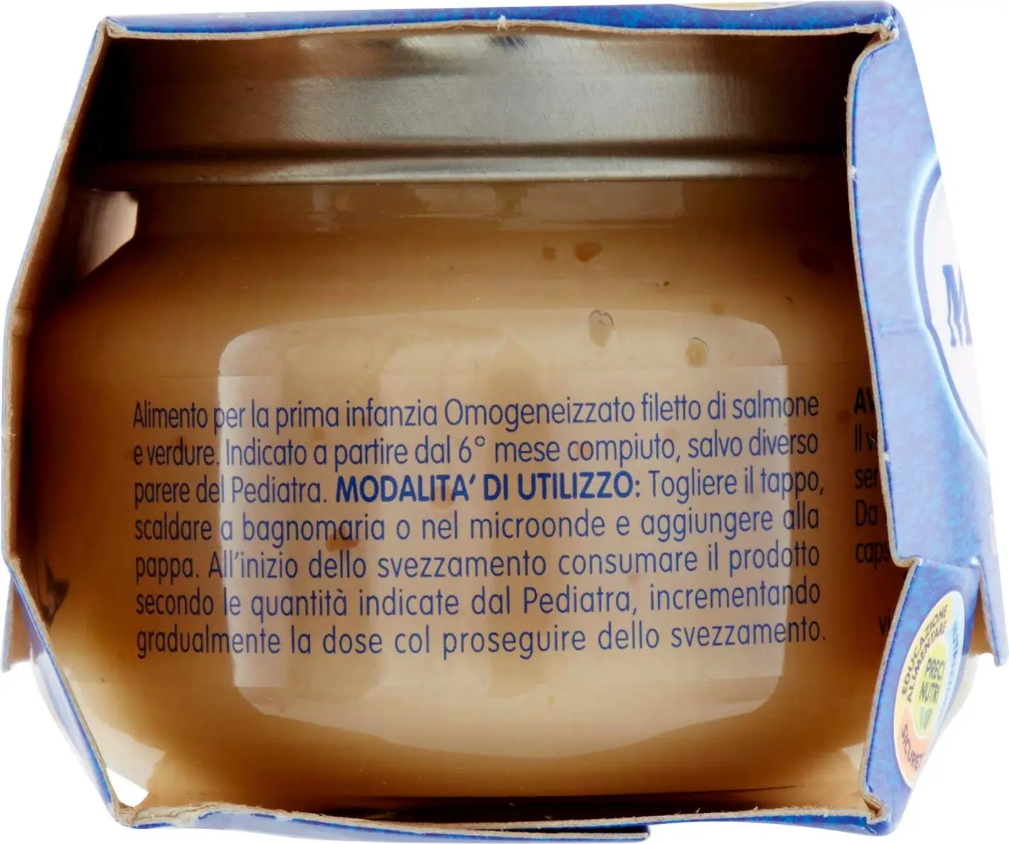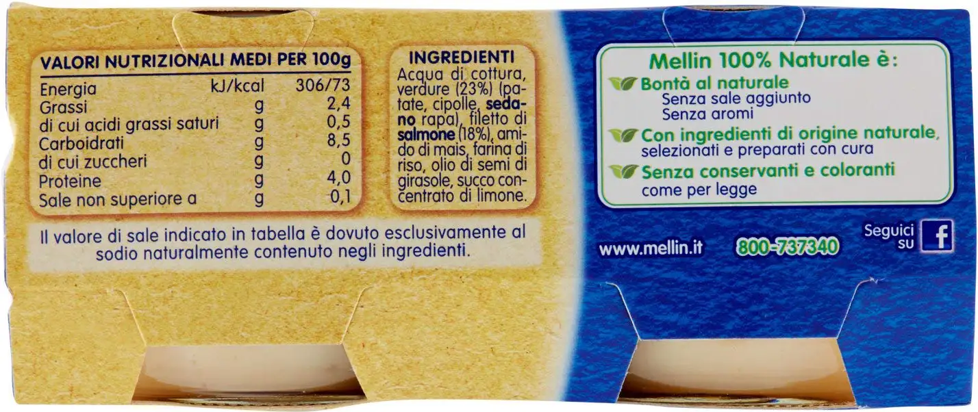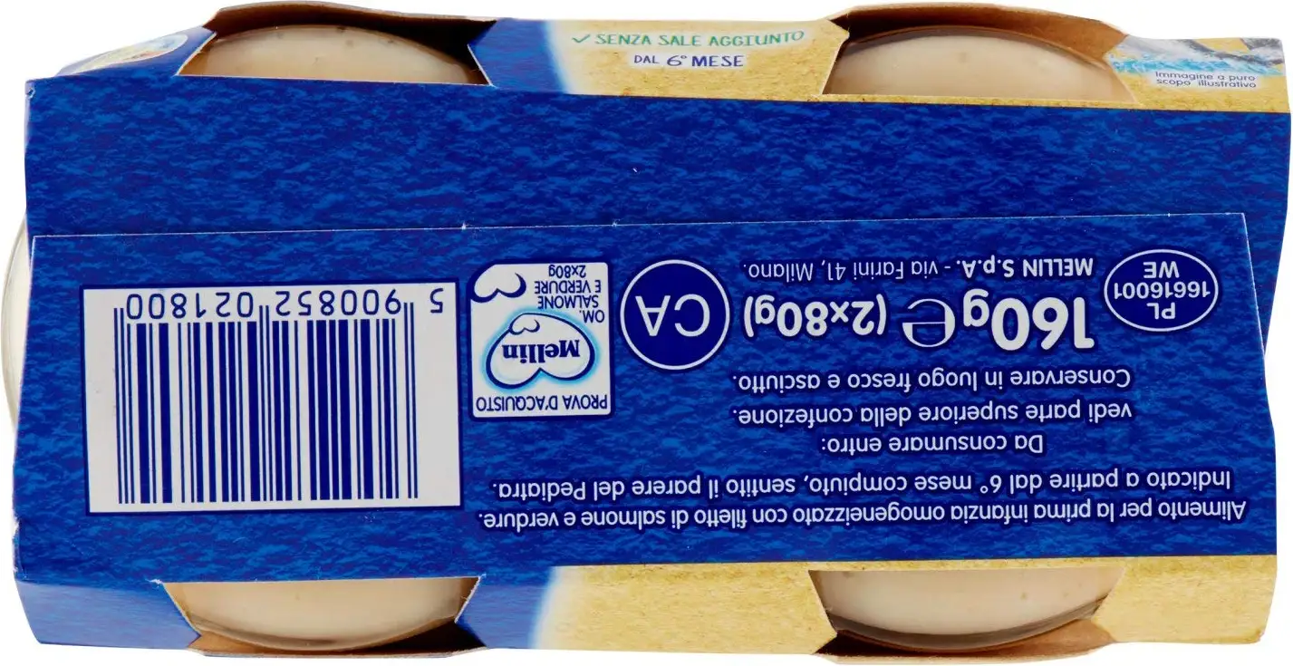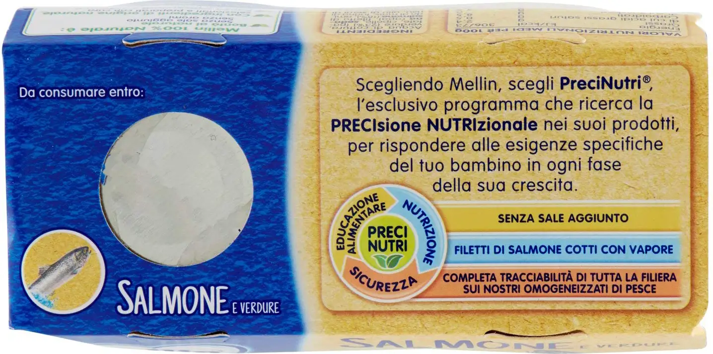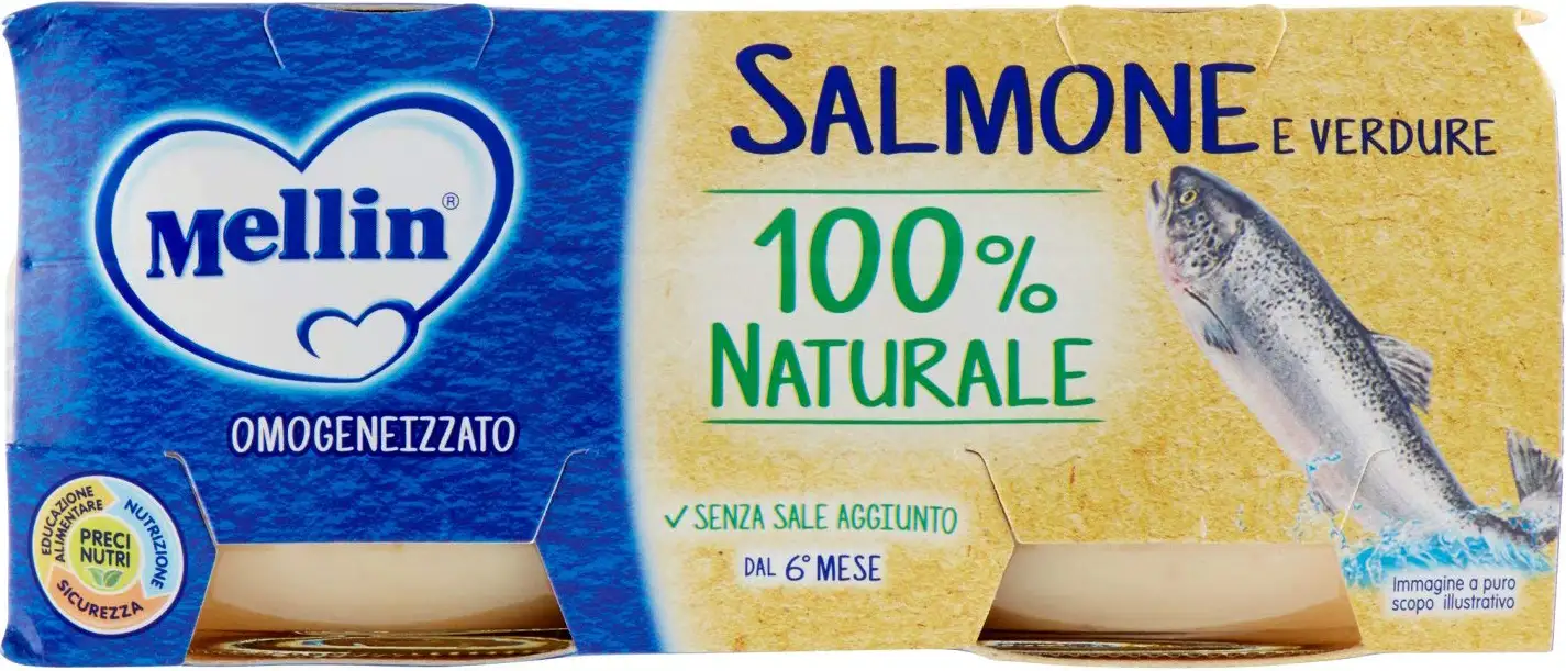 Homogenized with salmon fillet and vegetables. Suitable from 6 to 36 months unless otherwise advised by the pediatrician.