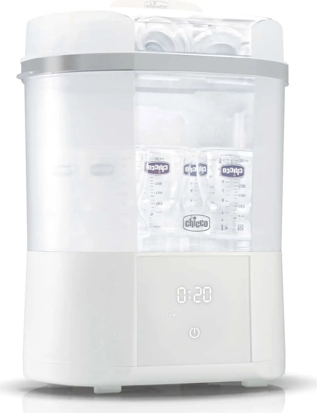 The Chicco sterilizer uses steam for natural sterilization, eliminating up to 99.9% of harmful germs in the home by sterilizing and drying your bottles and small objects quickly, naturally, and effectively. Holds up to 6 bottles. Sterilizes in 5 minutes (excluding heating time).