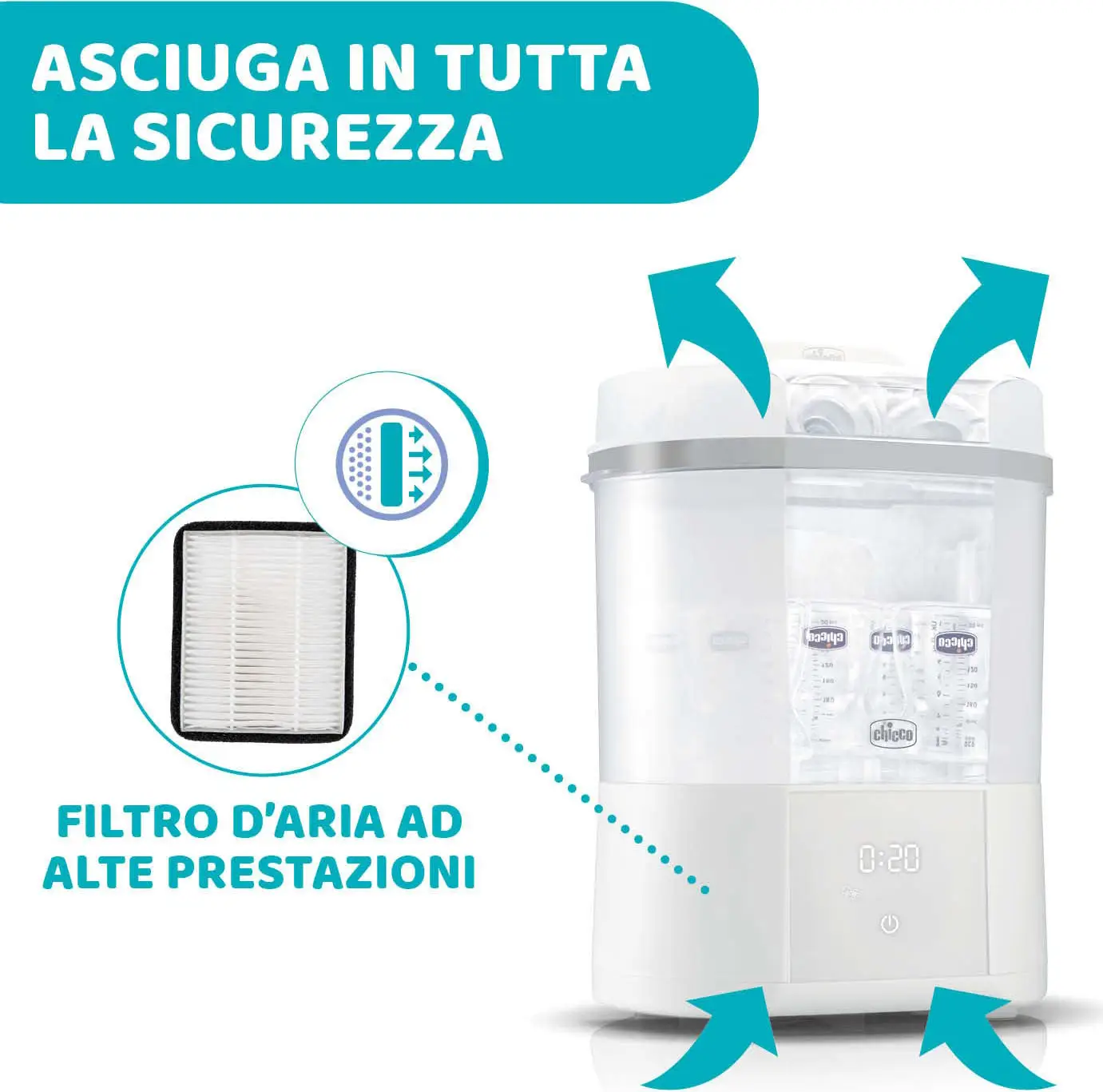 Chicco 2-in-1 multifunctional sterilizer sterilizes and dries bottles and small objects.