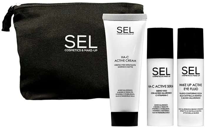 Discover the exclusive SEL Cosmetics set for hydrated and radiant skin: face cream, serum with hyaluronic acid and vitamin C, and eye contour fluid. A practical pouch completes this day and night skincare kit.