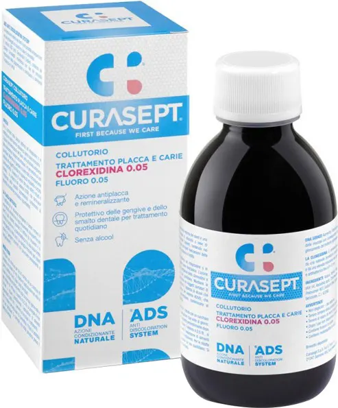 Ads plaque and tooth decay treatment is a mouthwash with Chlorhexidine 0.05, ADS and Fluoride 0.05 and is alcohol-free.