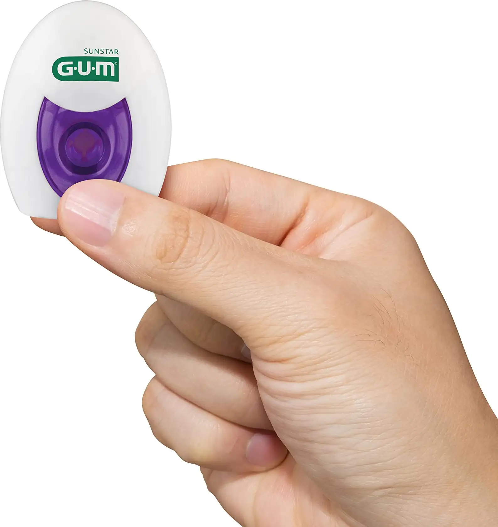 Wrap the ends of approximately 40 cm of G.U.M. dental floss around your fingers and gently insert the floss between your teeth, making sure to keep it taut between your thumbs and index fingers of both hands. Move the floss to remove any food residue and plaque, starting from the back molars, and making sure to use a clean portion of the floss each time you start cleaning a tooth.