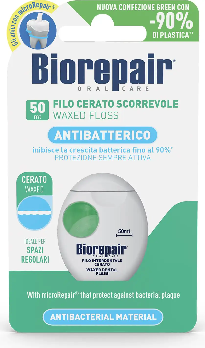 Antibacterial, waxed, gliding dental floss with microRepair®, for daily oral hygiene and regular spaces.