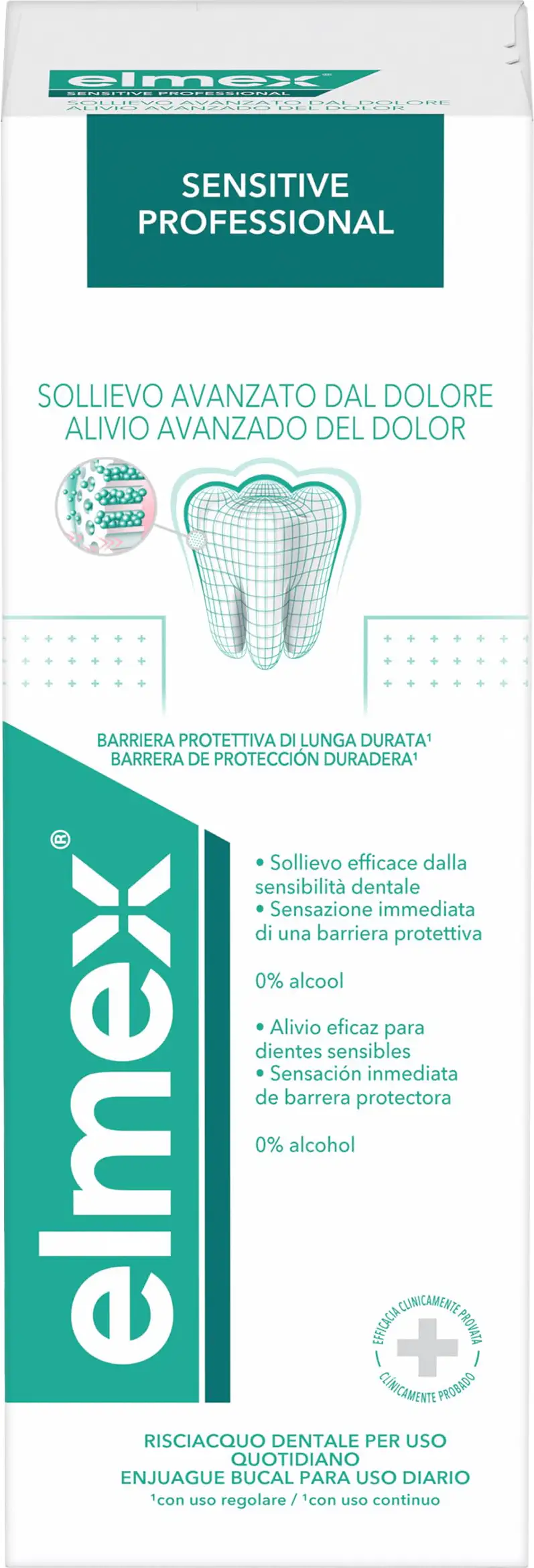 Elmex Sensitive professional mouthwash works by occluding the channels connected to the nerves, blocking pain. With regular use, it forms a long-lasting protective barrier that acts as a sealant against sensitivity and provides effective and long-lasting relief. Contains amine fluoride to help prevent cavities.