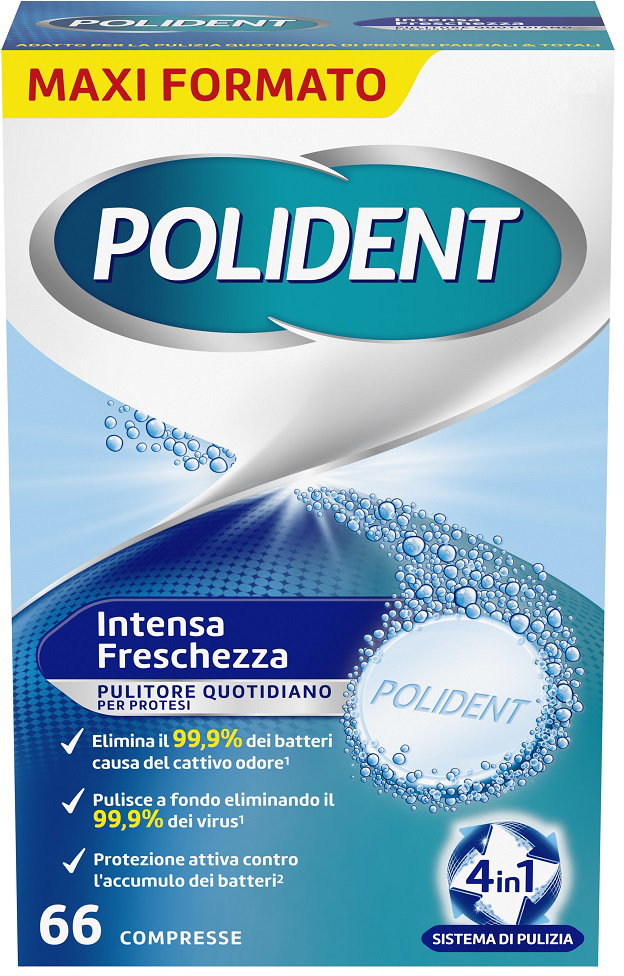 Polident Intense Freshness Tablets provide deep cleaning to restore the original whiteness of dentures and eliminate most viruses and bacteria that cause bad odors. When used according to the instructions, they help reduce plaque and remove stubborn stains to restore the original whiteness of dentures. It is gentle on denture materials and, thanks to its mint formula, leaves a feeling of freshness and cleanliness that lasts all day.