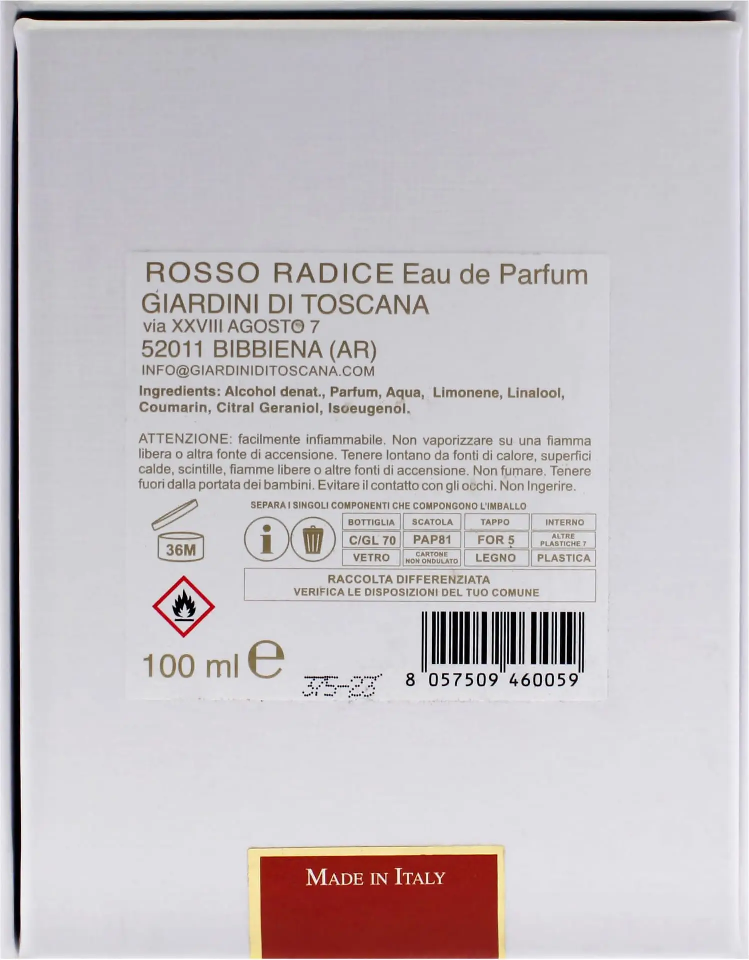 Rosso Radice Eau de Parfum by Giardini di Toscana is a perfume characterized by a very fresh opening note that enhances its personality: Calabrian bergamot, followed by vetiver, oak moss, and coumarin, to which are added notes of ambrettolide and ambroxan, which give roundness, warmth, and a strong fixing power. All wrapped up in Muscenone, with a strong, warm, and clean scent, with a soft yet powerful undertone of sensuality, almost erotic, and animality. The Iso and Super molecule is important, giving a velvety and amber sensation.
