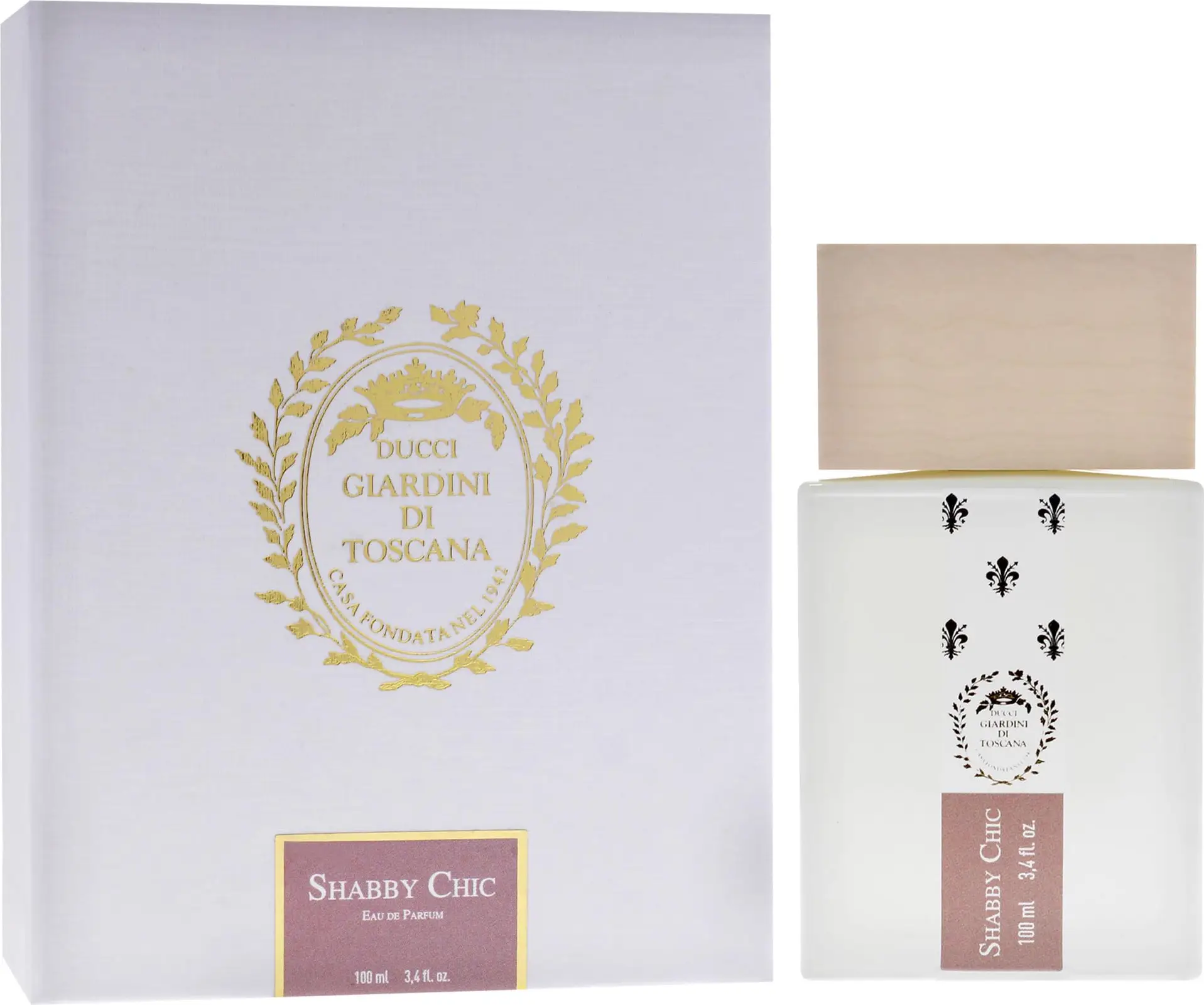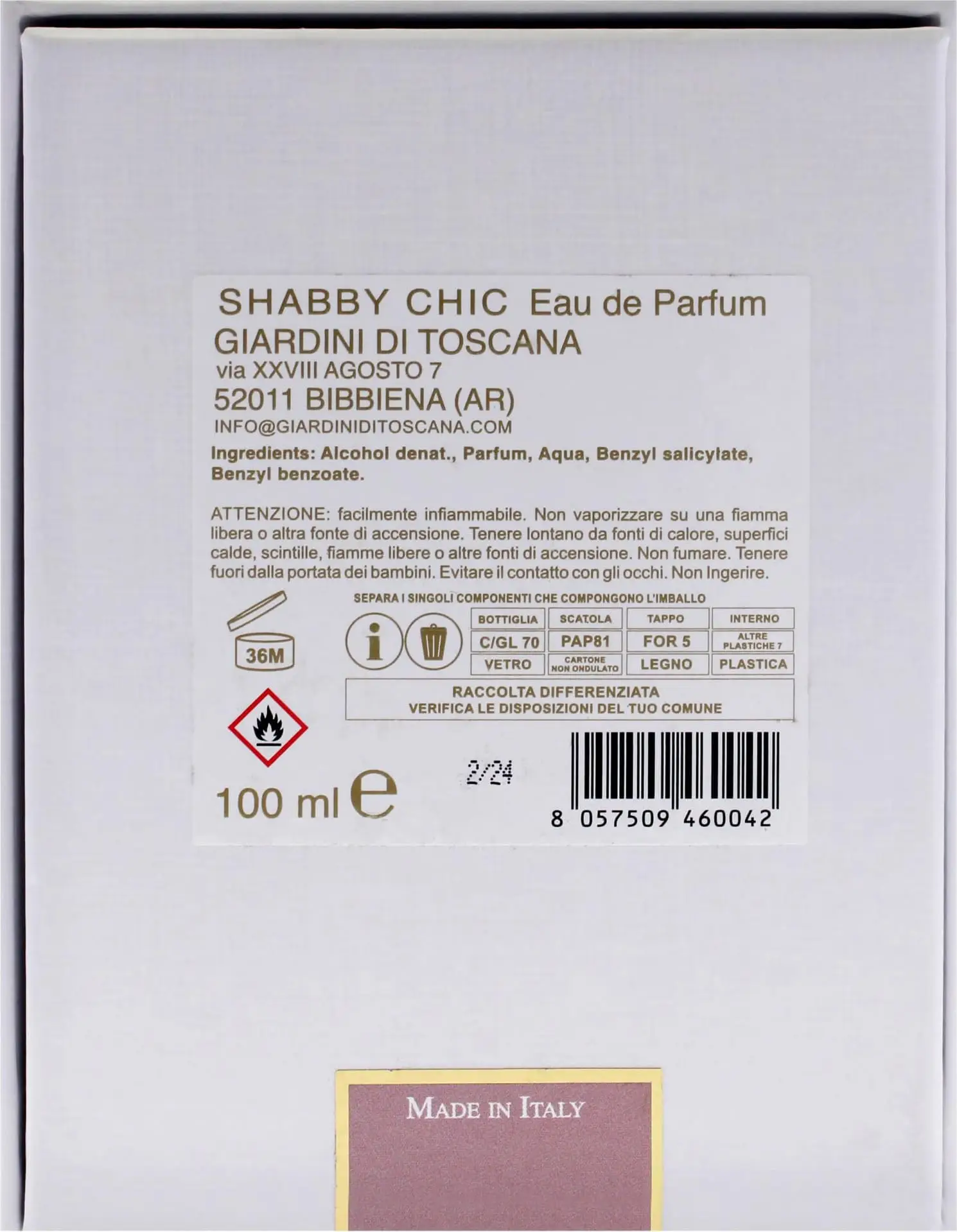 The Shabby Chic Eau de Parfum by Giardini di Toscana is a reassuring and enveloping perfume. Woods and floral notes envelop with softness and elegance. The pleasantness of Virginia cedar wood and a delicate floral touch of the queen of flowers, the delicate and slightly honeyed Bulgarian Rose. Javanol, the dominant sandalwood note, a new generation molecule, with a rich, natural, creamy, slightly rosy sandalwood.