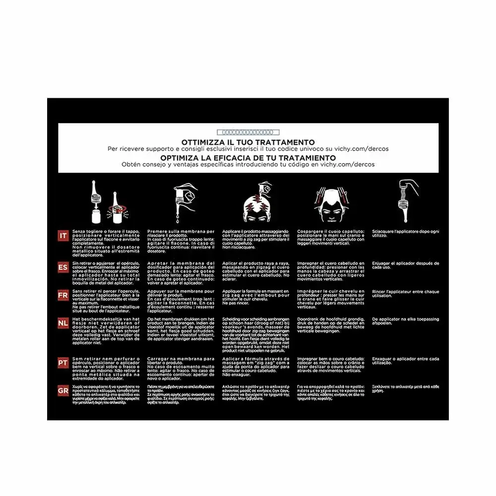 Anti-hair loss treatment specifically for men whose innovative formula acts on: anchoring (reduced hair loss in 6 weeks), microcirculation (stimulating massaging applicator), resistance (thicker and more resistant hair), balance (reduces micro-imbalances of the scalp), strength (increases resistance to scalp aggression).Optimal tolerability. Hypoallergenic, formulated to reduce the risk of allergies. Exclusive combination of Aminexil, a leading anti-hair loss molecule with clinically proven efficacy, with 5 active ingredients in a formula for complete action. Promotes anchoring to the scalp. Strengthens and makes the fiber resistant. Reduces micro-imbalances of the scalp and strengthens its resistance.
