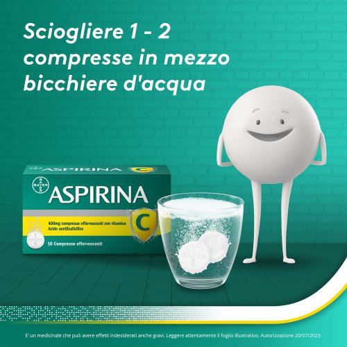 Adults a) 1–2 tablets as a single dose, repeating, if necessary, the dose at intervals of 4–8 hours up to 2–3 times a day. The tablets should always be taken with water, tea, lemonade, etc. b) 1–2 tablets as a single dose, repeating, if necessary, the dose at intervals of 4–8 hours up to 3–4 times a day. Aspirin C must always be dissolved before use (1 tablet in half a glass of water). The product is intended for use by adults only. Always use the lowest effective dose and increase it only if it is not sufficient to relieve symptoms (pain and fever). Do not exceed the recommended doses: elderly patients in particular should stick to the minimum doses indicated above. Those most at risk of serious side effects, who can use the medicine only if prescribed by a doctor, must carefully follow the instructions (see section 4.4). Use the medicine for the shortest possible period. Do not take the product for more than 3–5 days without consulting a doctor. Consult your doctor if symptoms persist. Take the medicine preferably after main meals or, in any case, on a full stomach. Paediatric population Aspirin tablets and Aspirin effervescent tablets with vitamin C are not indicated for use in the paediatric population (see section 4.4).