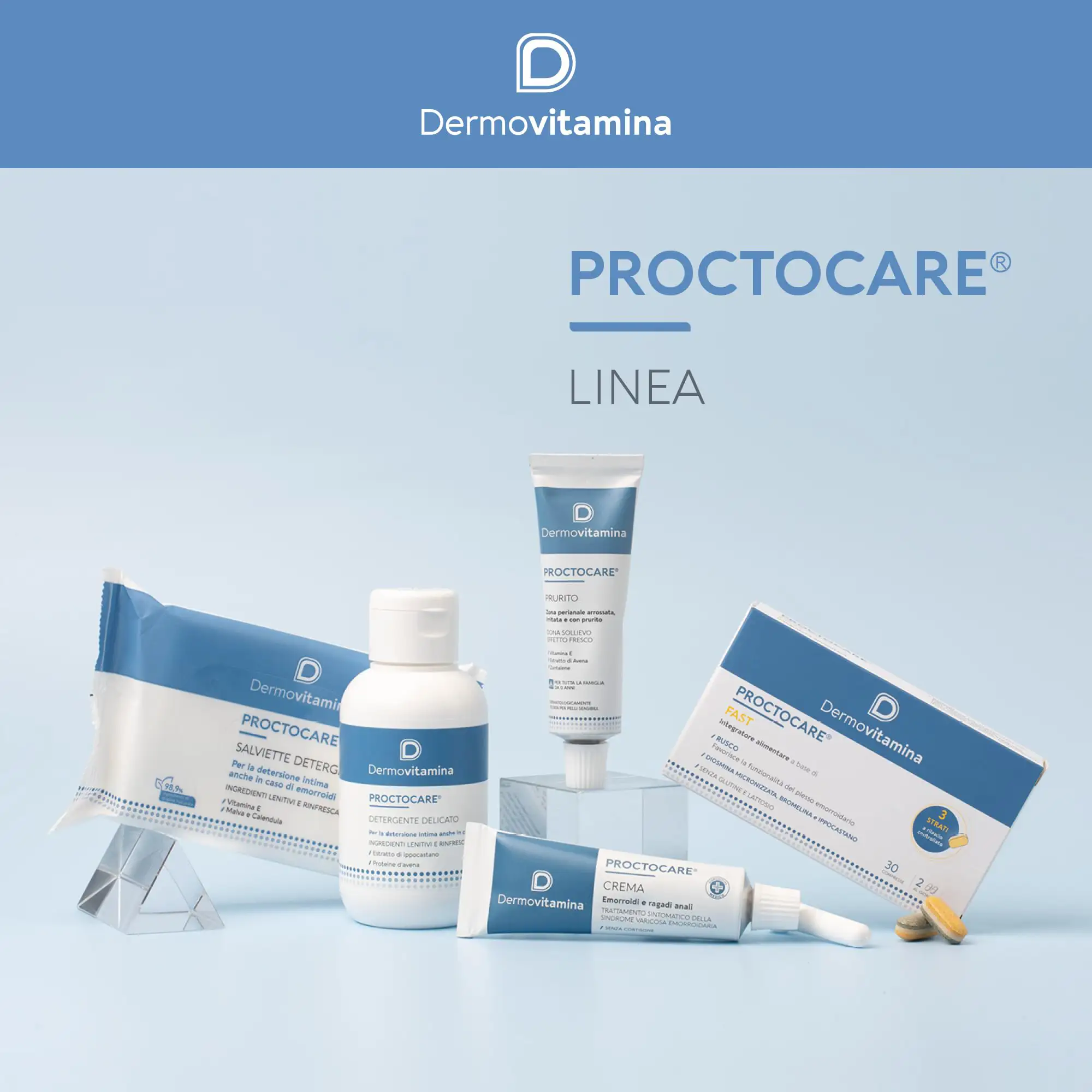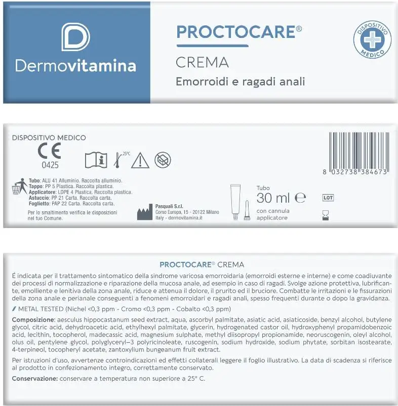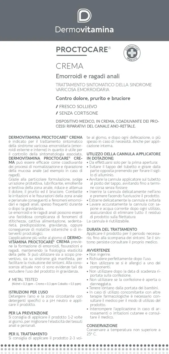 Dermovitamina Proctocare is indicated for the symptomatic treatment of varicose hemorrhoid syndrome (external and internal hemorrhoids) as it is useful for controlling the associated symptoms;