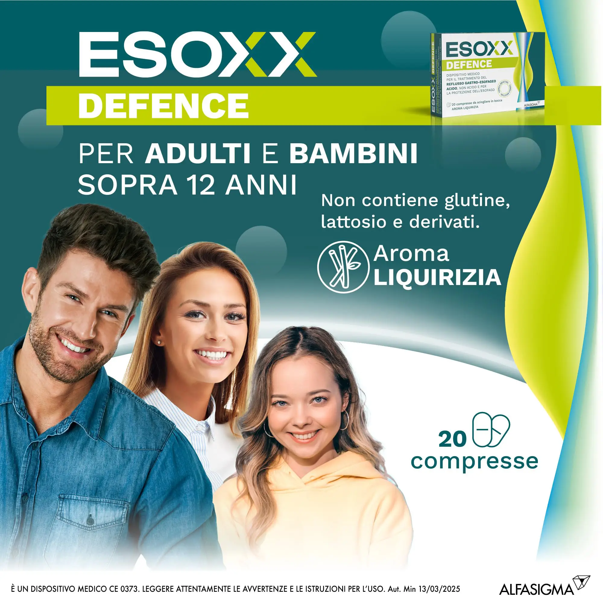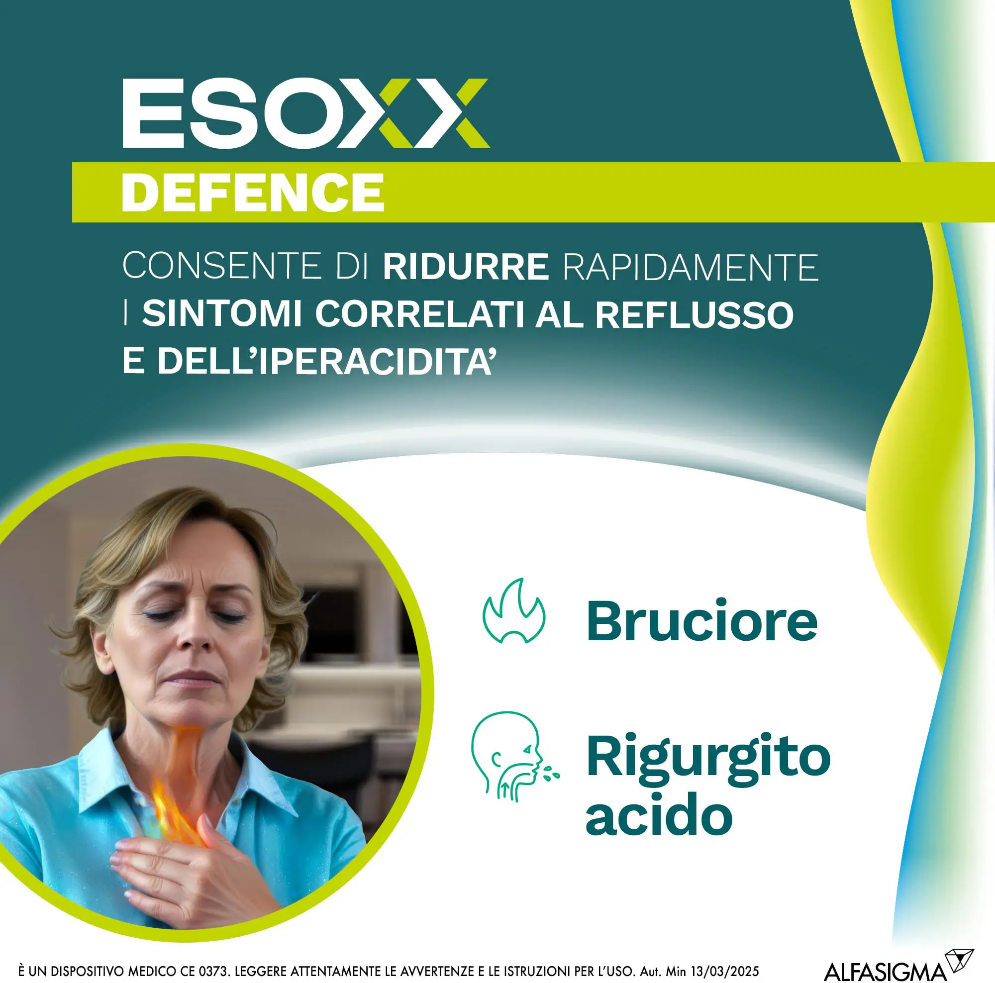 Esoxx Defence is a medical device formulated to offer a fast and effective solution for GERD. Its mechanical action creates a protective barrier that helps reduce the main symptoms, including heartburn, epigastric pain, acid regurgitation, irritative cough, and dysphonia, significantly improving comfort and quality of life.