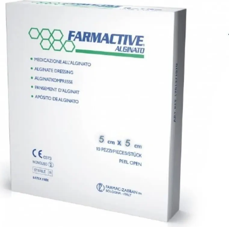 Farmactive Alginate is a sterile calcium alginate dressing with carboxymethylcellulose in tablet or tape form. It is used for the treatment of moderately to heavily exuding skin lesions such as pressure sores, venous ulcers, diabetic ulcers, skin graft sites, and traumatic wounds.