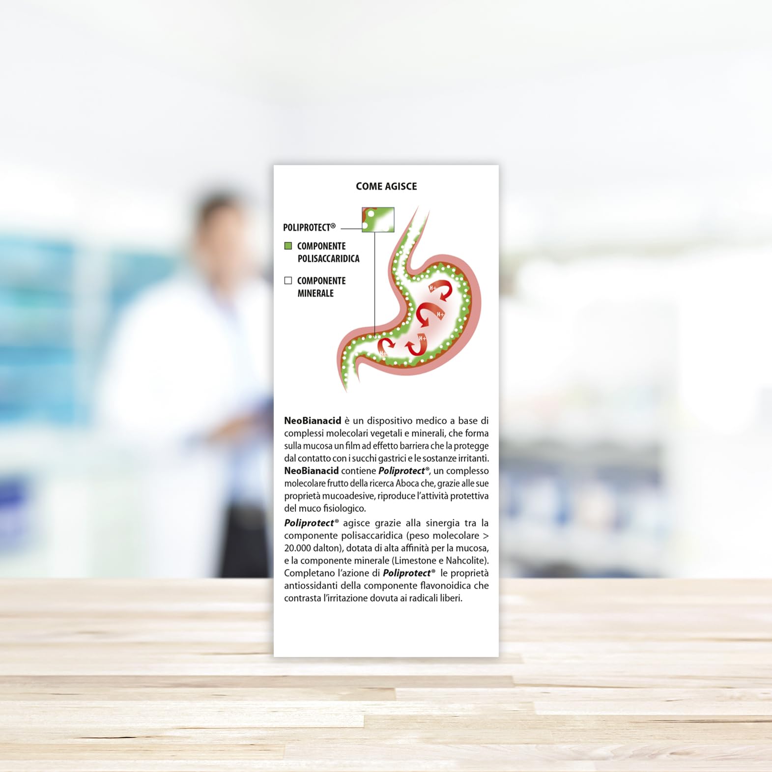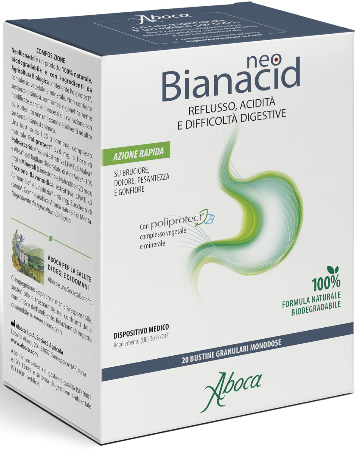 It contains Poliprotect, a molecular complex resulting from Aboca research with muco-adhesive properties, which works thanks to the synergy between the polysaccharide component (molecular weight > 20,000 Daltons) and the mineral component (Limestone and Nahcolite). The antioxidant properties of the flavonoid component, which counteracts irritation due to free radicals, complete the action of Poliprotect.