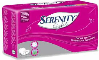 Serenity Light An innovative solution for protection and peace of mind in the event of minor urine leaks. Starting today, you can discover an important aid to rediscover the joy of moving and living your daily life to the fullest. Incontinence, even mild, can cause discomfort and become an obstacle to everyday life. The new Serenity Light Lady has been further improved to provide a comfortable and discreet solution every day, thanks to its unique features. Protection, comfort, and fit. All in one pad. Serenity Light Lady is worn with your underwear and becomes almost invisible. This is thanks to a thin and compact absorbent pad, curved elastic straps that offer excellent adhesion, a strong longitudinal adhesive strip, and an anatomical shape that adheres to your body, designed to protect you where you need it, without marking. Goodbye embarrassment, hello serenity. Free yourself from the discomfort caused by unpleasant odors: the OdourZero™ anti-odor system traps liquids in special microgranules, offering you the discretion and comfort you need. Furthermore, the innovative central channel with the Fast & Dry™ system allows for even distribution of liquids, while the micro-perforated absorption layer increases absorption speed and prevents them from returning to the surface, giving you a pleasant feeling of dryness and freshness that will last a long time, no matter what you do. Gentle, to protect you. The secret of the new Serenity Light Lady skin protection? Aloe vera, chamomile, vitamin E, olive oil, silk proteins: the extracts of these 5 multi-botanical elements make the fabric of the new sanitary pads gentle, helping prevent the risk of skin redness. New solutions, new packaging. To be even closer to your needs. In addition to the traditional Normal, Extra, Super, and Maxi sizes, Serenity Light is proud to introduce the new Mini size, available in a convenient pack of 20. Its slim design, almost as thin as a panty liner, makes it easy and convenient to manage small urine leaks. Serenity has also reduced the pack size from 12 to 10 for easier transport and less bulk.