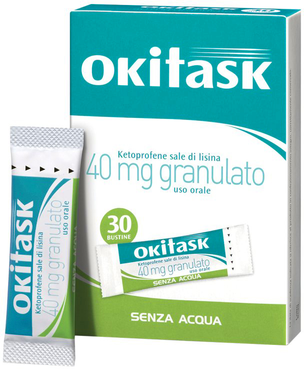 Adults and children over 15 years: 1 sachet once, or repeated 2-3 times a day, for more intense forms of pain. The contents of the sachet can be placed directly on the tongue: Okitask® orosoluble dissolves in saliva, allowing it to be used without water.