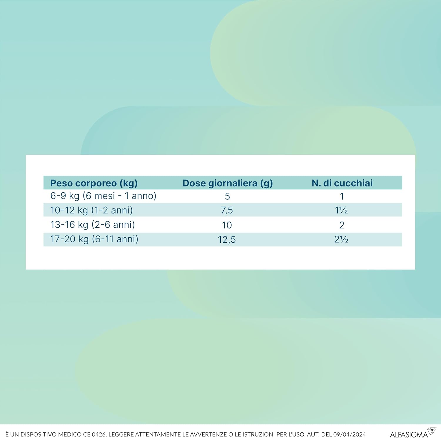 The dosage should be commensurate with body weight. We therefore recommend using the 200 g bottle of powder with a measuring spoon that allows you to customize the dose according to the child's actual needs until soft stools are obtained. Do not exceed the maximum daily dose of 30 g.