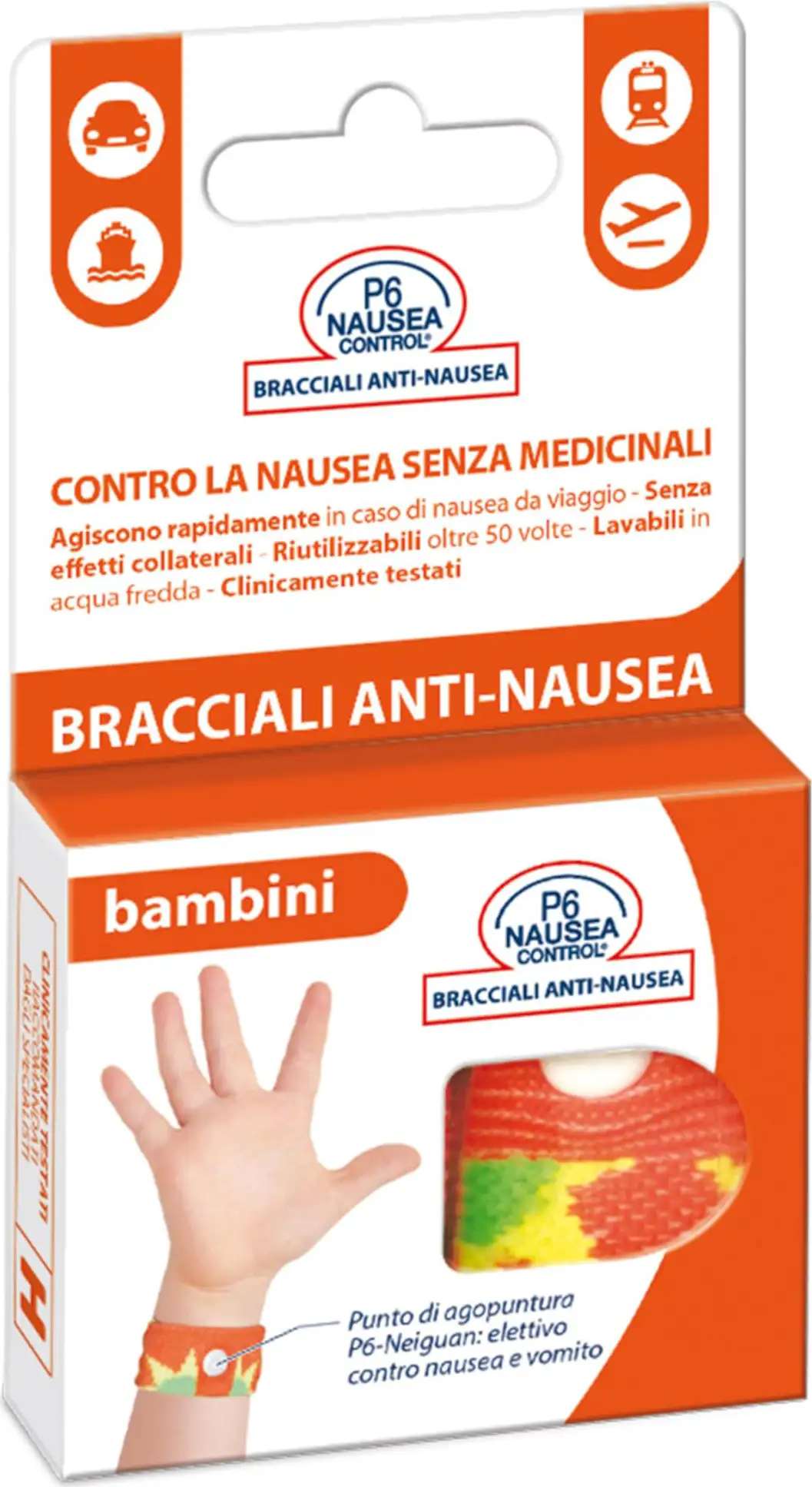 P6 Nausea Control Sea Bandfor children are bracelets, to be worn on both wrists, designed to reproduce the effects of acupressure and allow you to obtain control of nausea, car sickness, seasickness and airsickness without the aid of drugs.