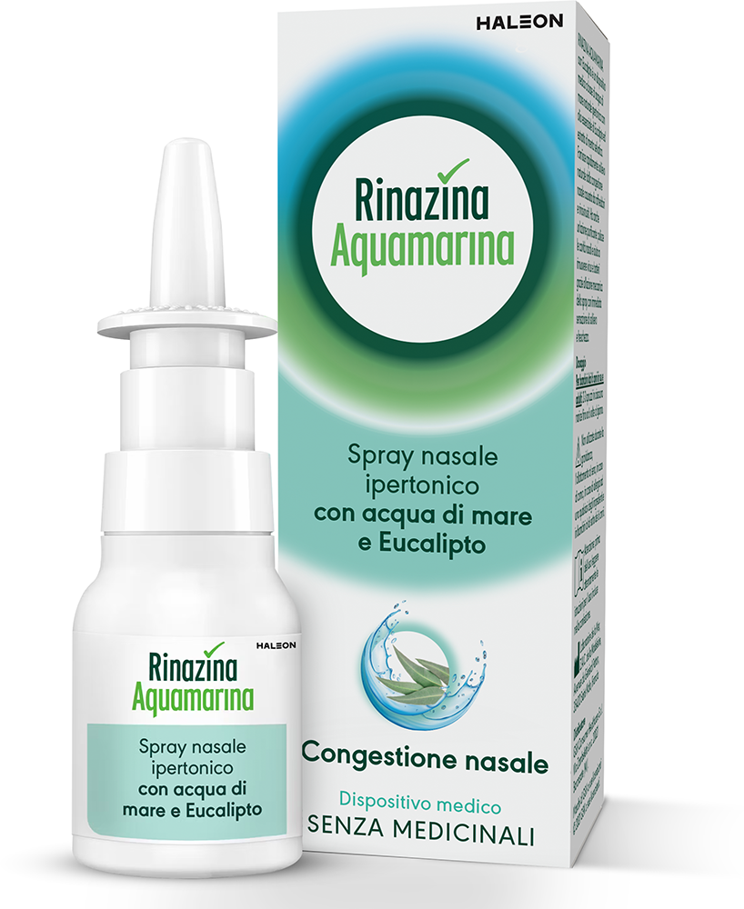 Furthermore, Rinazina Aquamarina hypertonic nasal spray with eucalyptus liquefies and softens excess mucus and, thanks to the cleansing action of the solution, removes germs and bacteria from the nasal cavities.