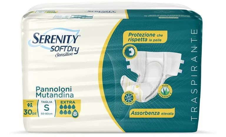 Soft Dry Sensitive thanks to the absorbent pad, quickly captures urine and keeps it away from the skin, offering a dry sensation. Thanks to the anatomical shape, the soft elastic bands around the thighs and the practical repositionable closures, it offers great comfort to the wearer and practicality for those who must manage them daily. The soft, breathable non-woven fabric allows heat and humidity to escape, so the skin is free to breathe. The dermoprotective treatment with aloe and Vitamin E, on the entire lining in contact with the skin, makes it suitable for sensitive and easily irritated skin.