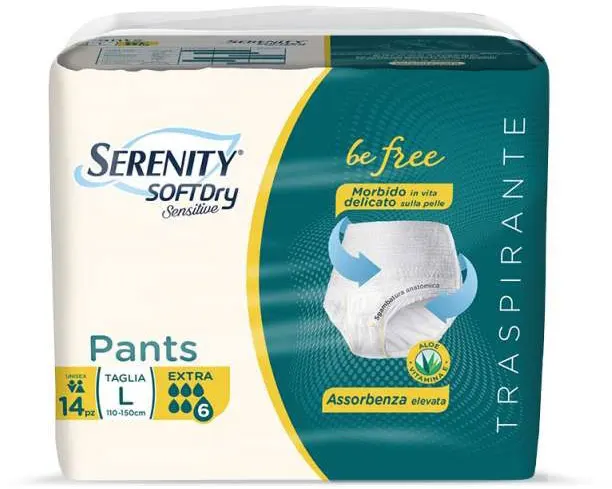 The Serenity Softdry Sensitive Pants represent the product with the most High absorbency in the Serenity world, breathable and equipped with an internal lining in non-woven fabric treated with Vitamin C and Aloe that keep the skin healthy, dry and protected.