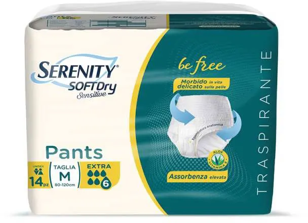 The Serenity Softdry Sensitive Pants represent the product with the most High absorbency in the Serenity world, breathable and equipped with an internal lining in non-woven fabric treated with Vitamin C and Aloe that keep the skin healthy, dry and protected.