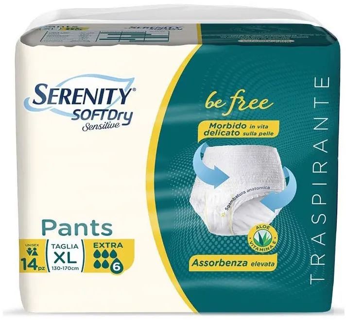 The Serenity Softdry Sensitive Pants represent the product with the most High absorbency in the Serenity world, breathable and equipped with an internal lining in non-woven fabric treated with Vitamin C and Aloe that keep the skin healthy, dry and protected.
