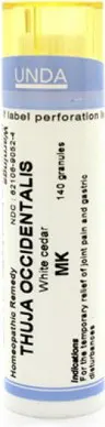 Cemon Thuya Occidentalis Homeopathic product in centesimal dilution for the treatment of irritability, impatience, pessimism, anxiety, insomnia, migraines, warts, skin blemishes, brittle nails, varicose veins, strong-odor sweating, polyps, urinary tract infections and inflammations, abdominal pain, menstrual pain, and constipation.