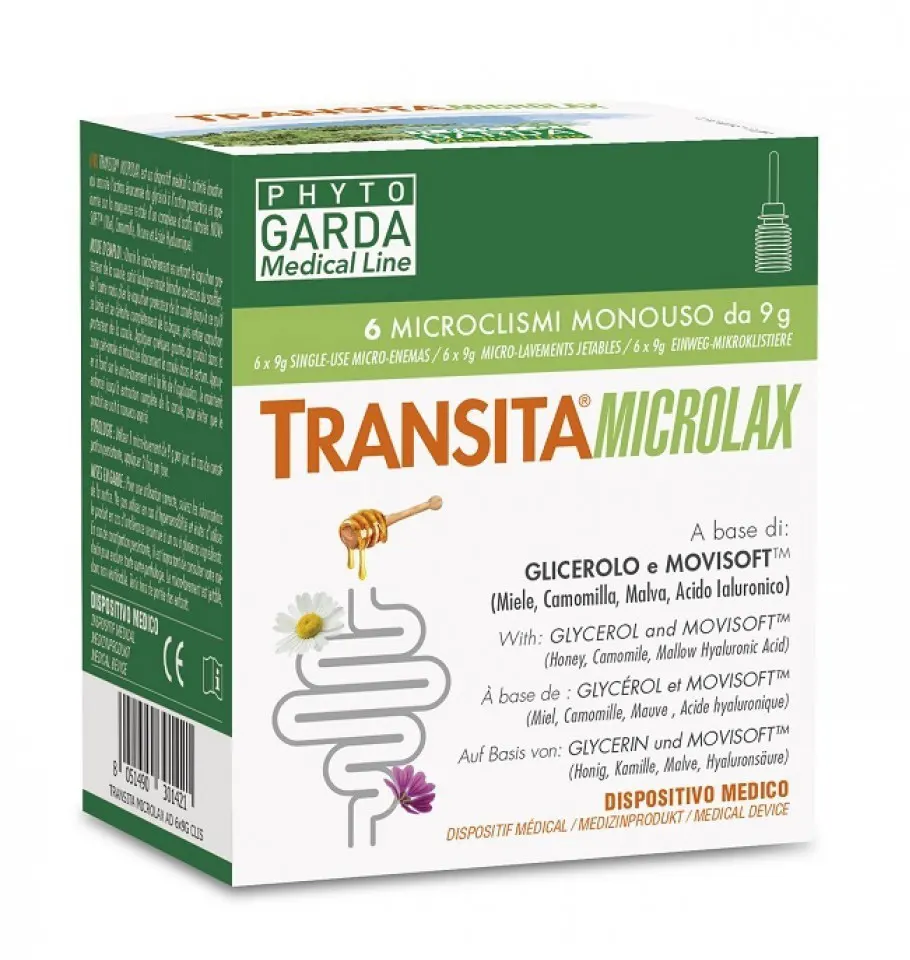 Transita microlax is a medical device with laxative action that combines the evacuative action of glycerol with the protective action on the rectal mucosa of Movisoft, a complex of natural, antioxidant and soothing active ingredients composed of Honey, Chamomile, Mallow and Hyaluronic Acid.