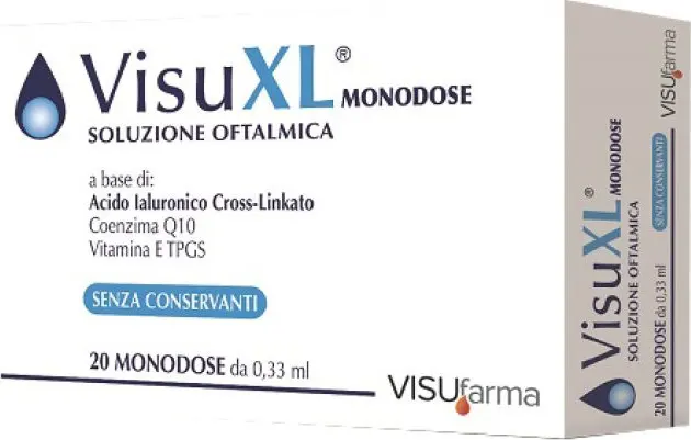 VisuXL preservative-free lubricating and antioxidant ophthalmic solution based on coenzyme Q10, vitamin E TPGS and cross-linked hyaluronic acid sodium salt.