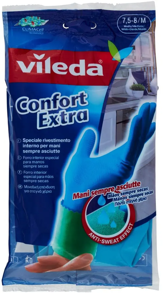 With the innovative Vileda Confort Extra natural latex gloves, daily cleaning becomes a safe, quick and fun task. These gloves are the perfect choice for household chores such as washing dishes or cleaning the kitchen and bathroom. And that's not all: they are enriched with an absorbent inner lining that prevents hands from sweating even after prolonged use.