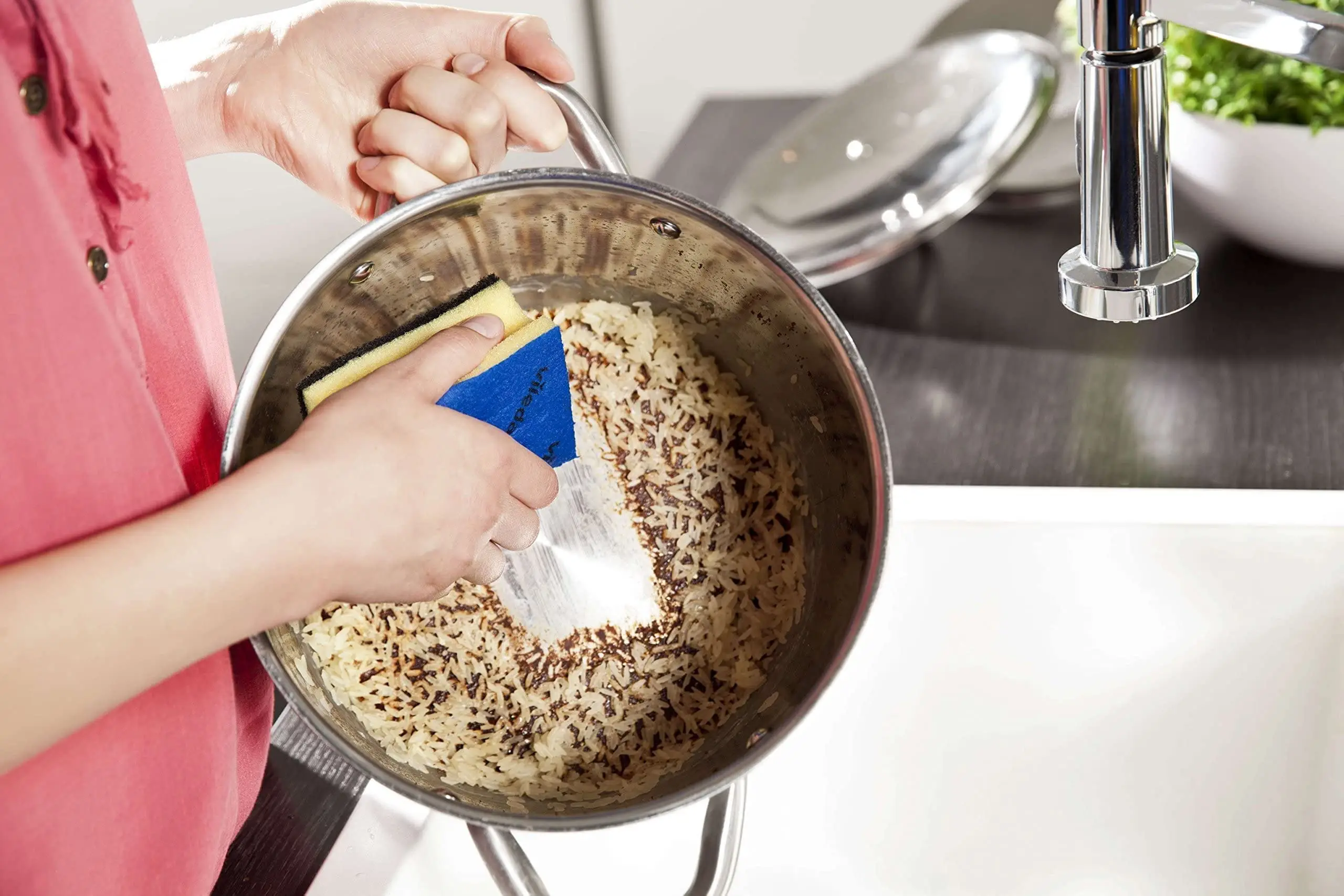 This scrubbing sponge removes stubborn dirt deep down. The antibacterial treatment prevents the growth of bacteria by up to 99.9% on the abrasive part.