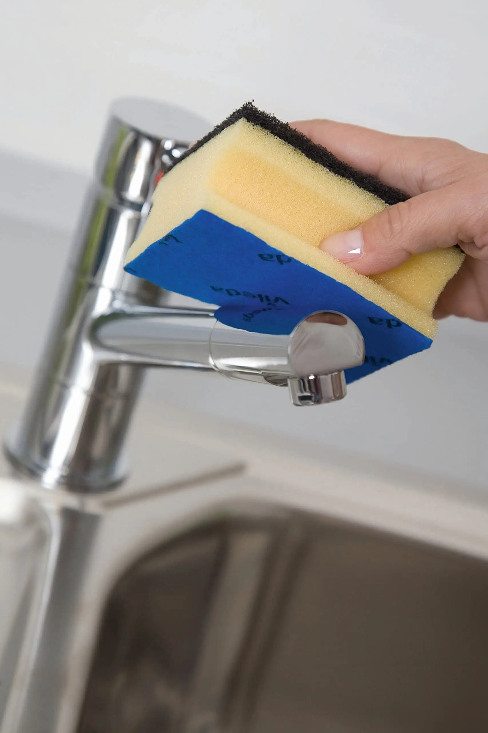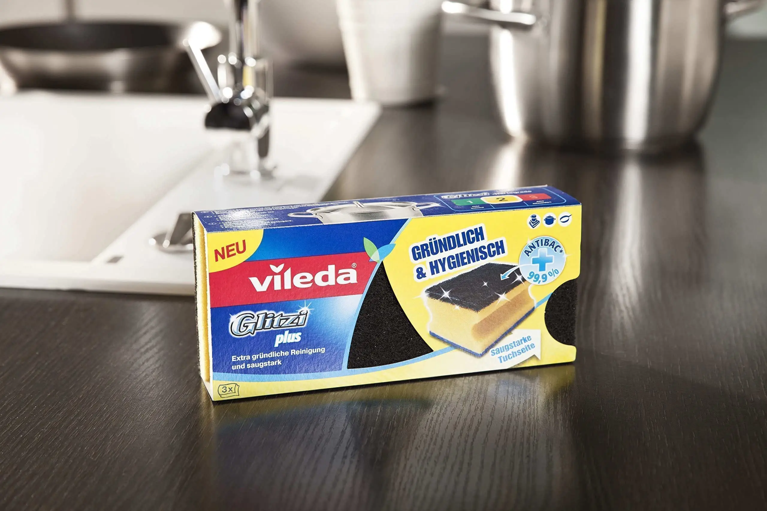 The Glitzi Plus abrasive sponge is super absorbent and resistant to bacteria. Its high cleaning power comes from a thick sponge layer, a black abrasive layer, and an additional layer of absorbent cloth.