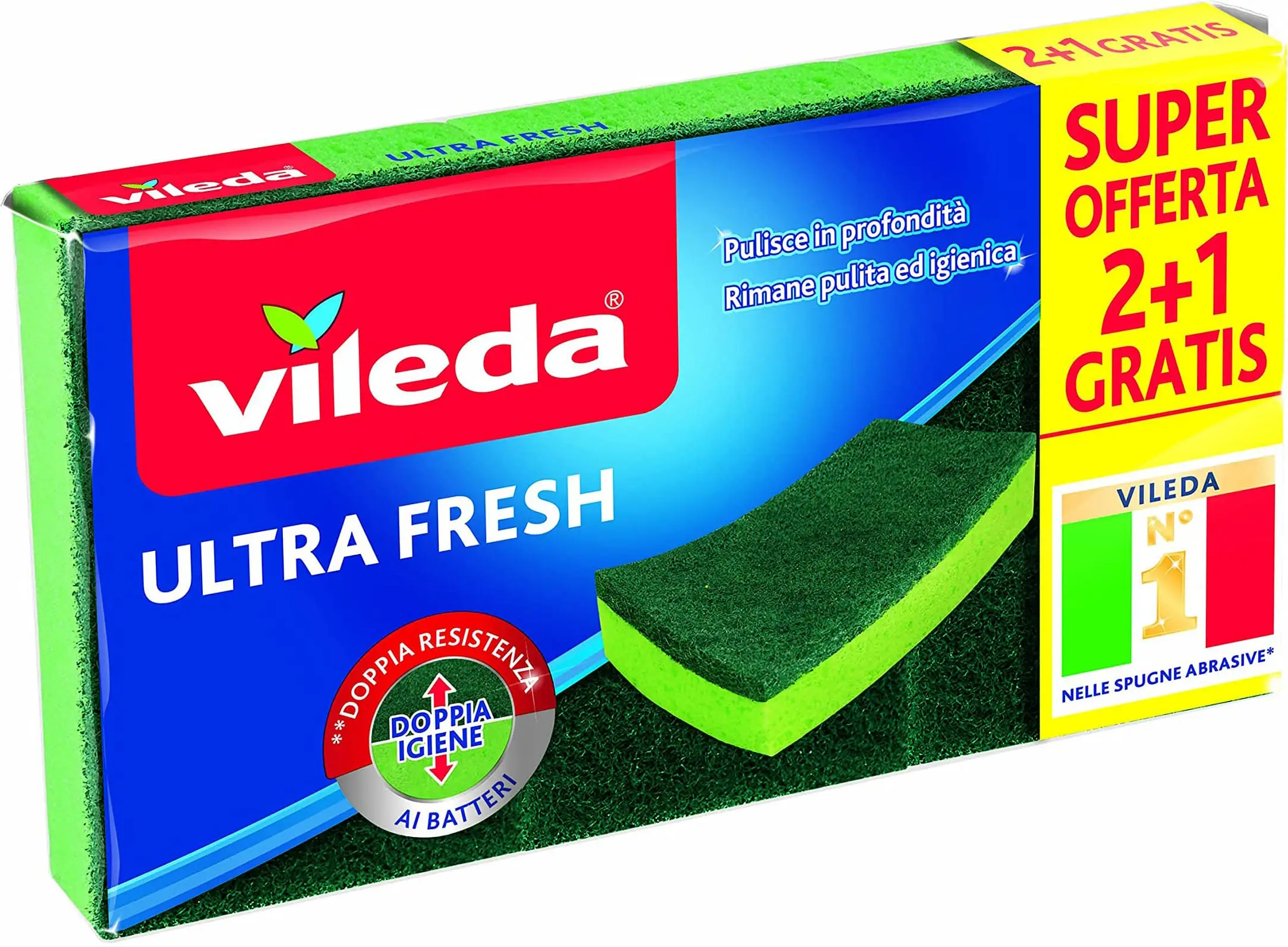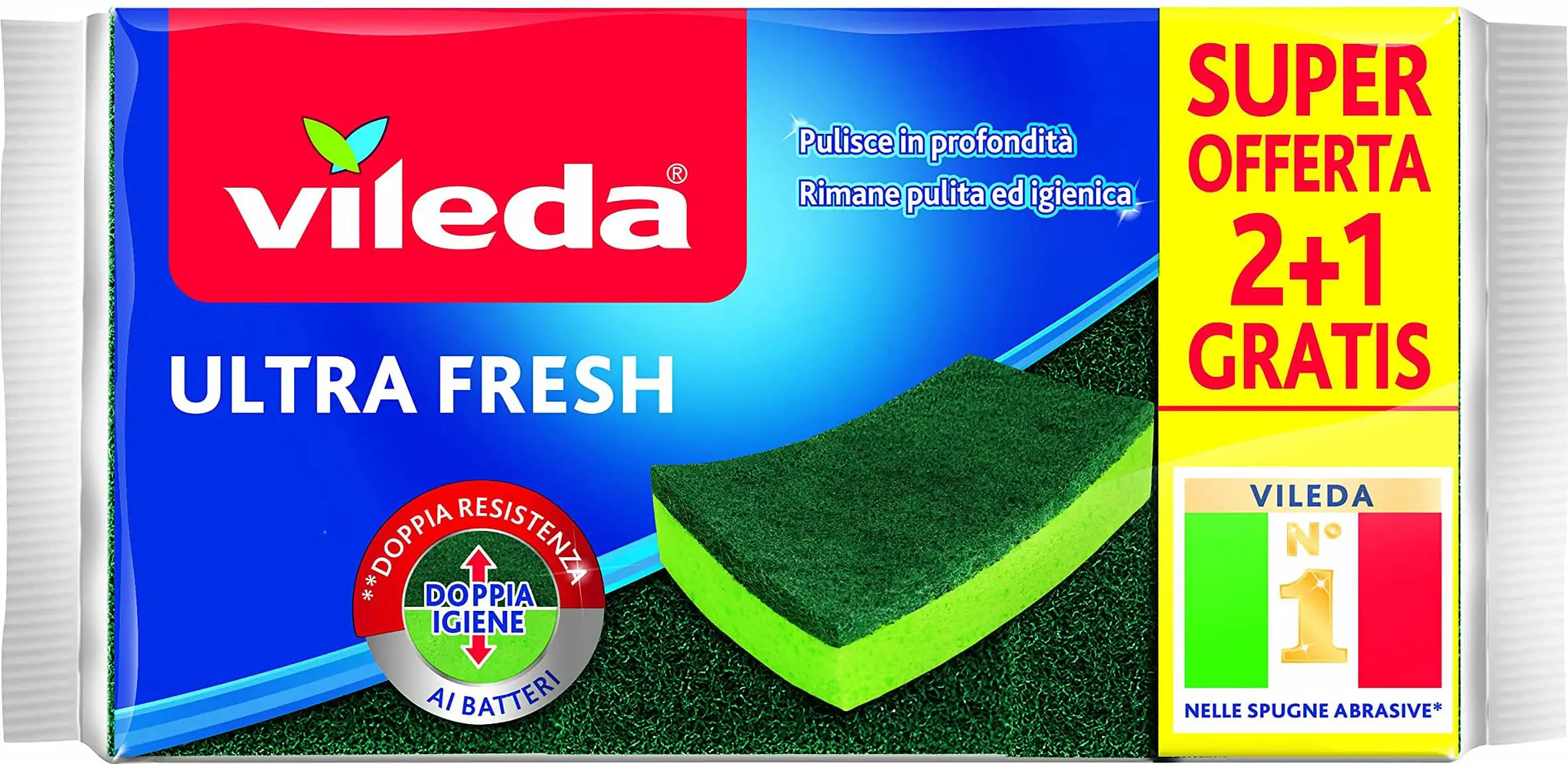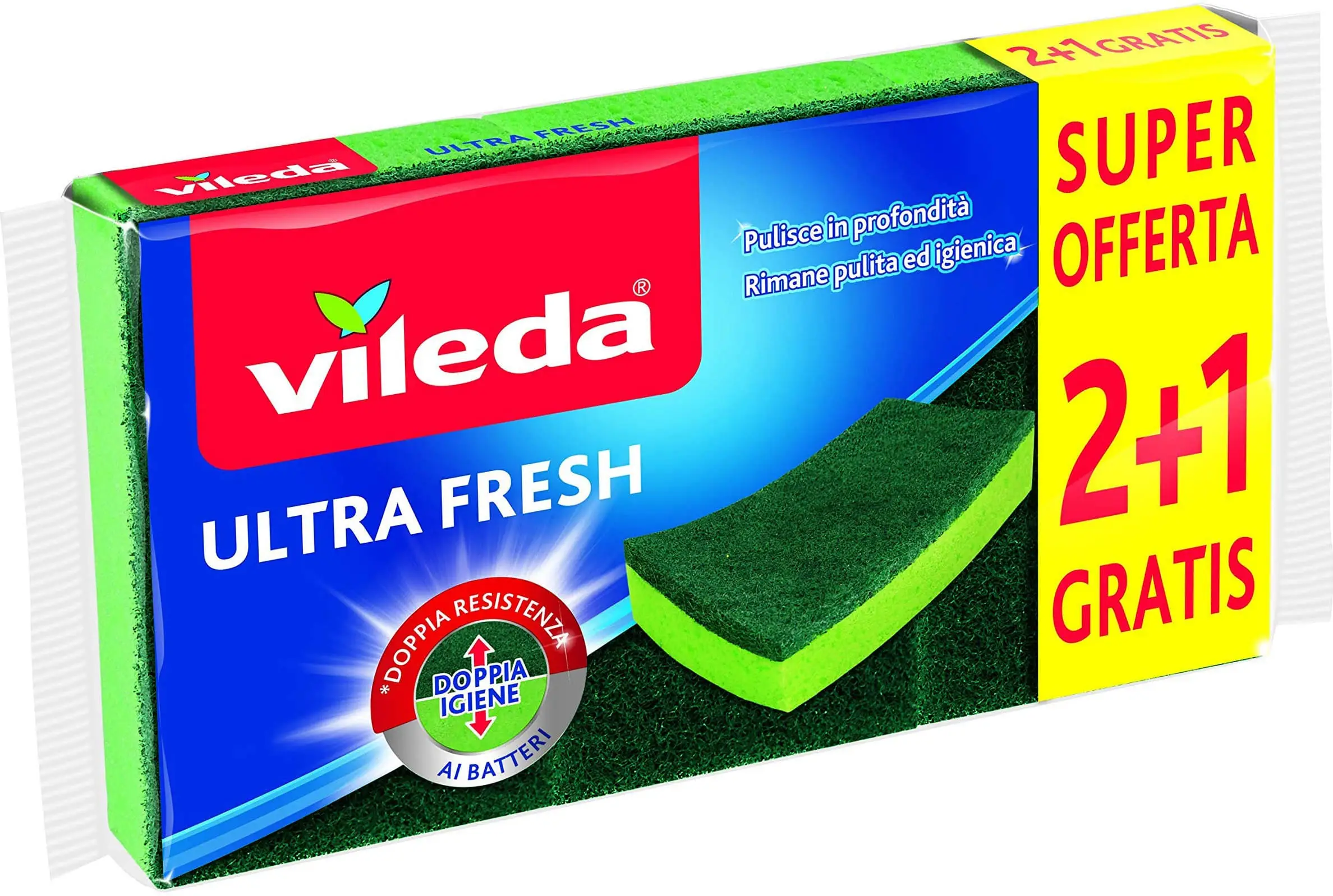 The Vileda Ultra Fresh are high-quality abrasive sponges. Made of a double layer (one abrasive and one absorbent), they are able to retain a lot of water. This is the first Vileda product to be subjected to a double antibacterial treatment, present on both the fibrous and spongy parts.