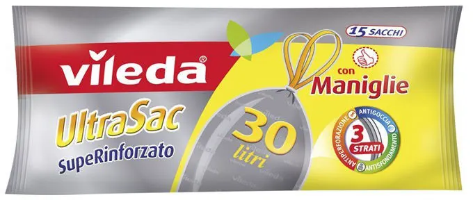 UltraSac SuperRinforzato 30 L with Handles by Vileda are garbage bags with a large capacity, safe and efficient. They are made of 100% virgin material. These bags feature the following system: