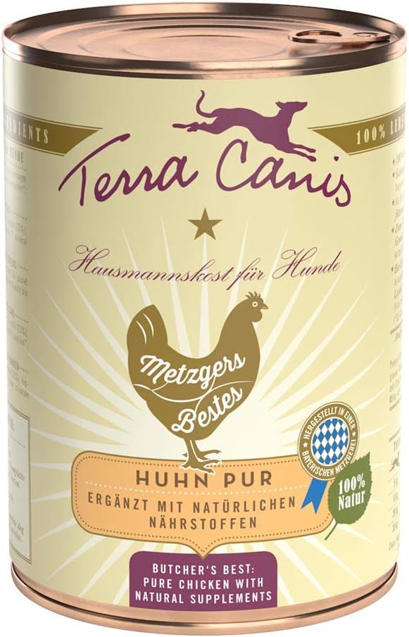Terra Canis Butcher's Best Pure Chicken is a complementary food formulated for all adult dogs. It is single-protein, grain-free and lactose-free, offering a practical alternative to a raw meat diet and a valid replacement for the B.A.R.F. diet on holiday or while travelling. Terra Canis wet complementary foods are prepared in a traditional butcher's shop in Munich, using 100% Human Grade ingredients.