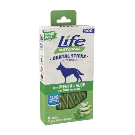 Life Natural Natural Dental Sticks medium/large (mint and aloe) is a natural dental snack, with ingredients such as mint and aloe, which help freshen your dog's breath. It has a good chewing duration, useful for reducing tartar from your dog's teeth. It is a snack free of added sugars and artificial colorings. This format is Specific for large breed dogs.